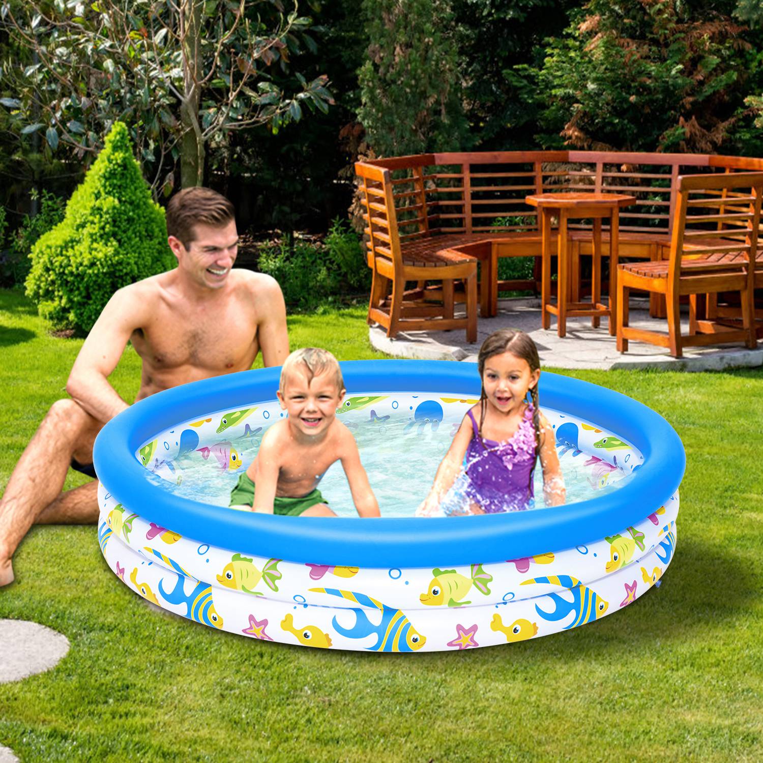 - HAPPY KIDS TOGETHER:48x48x10” Inflatable size is recommended 2 kids to enjoy splashing pool party in the backyard. Printed pattern of fish will definitely inspire children’s storytelling and creativity skills on a hot day.