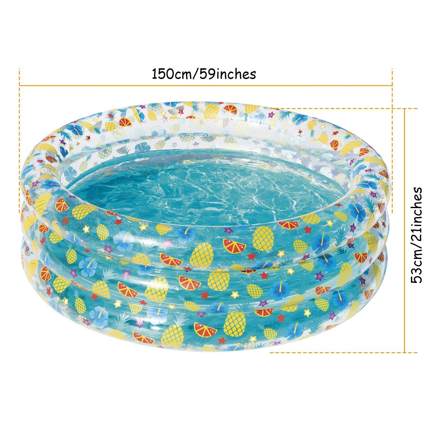 - HAPPY KIDS TOGETHER:59x21” Inflatable size is recommended 3 kids to enjoy splashing pool party in the backyard. Printed pattern of fruits will definitely inspire children’s storytelling and creativity skills on a hot day.