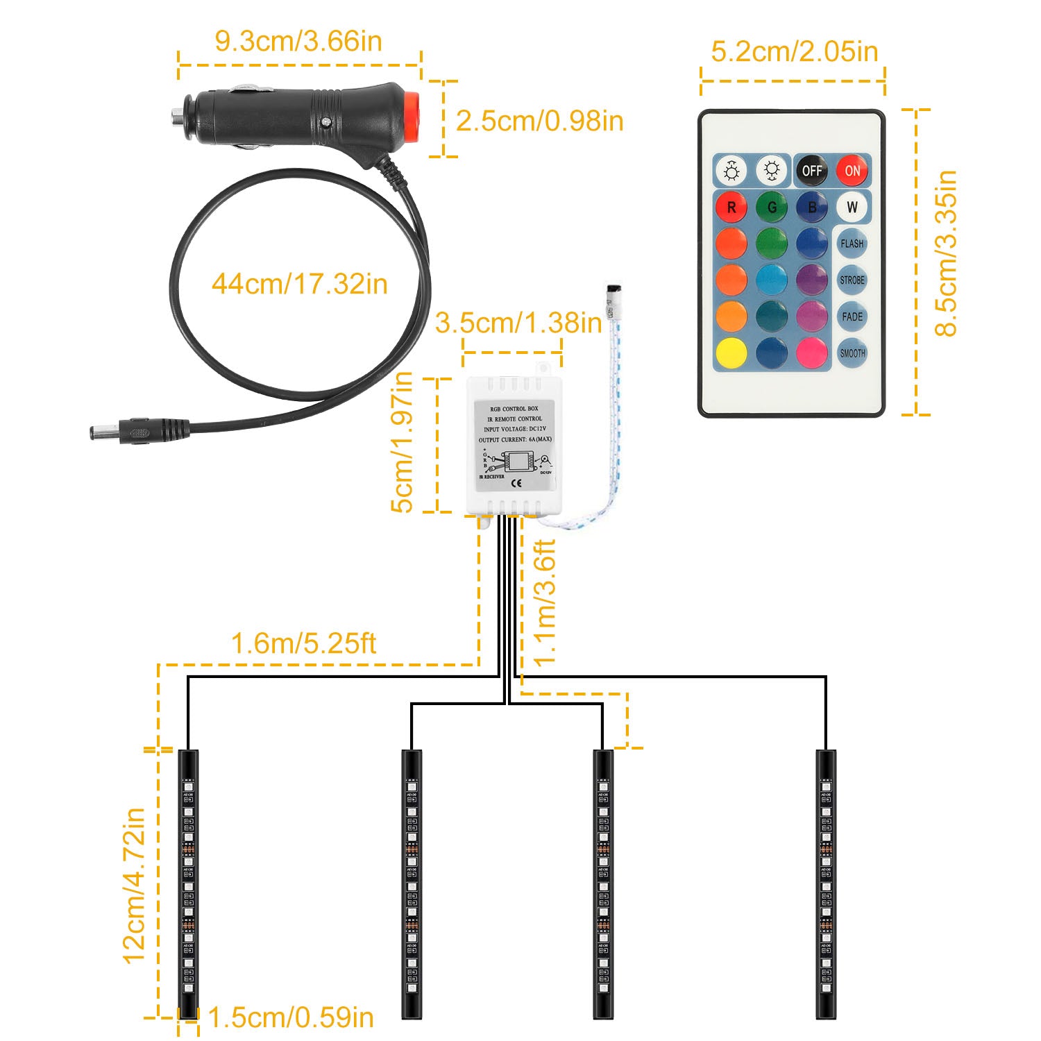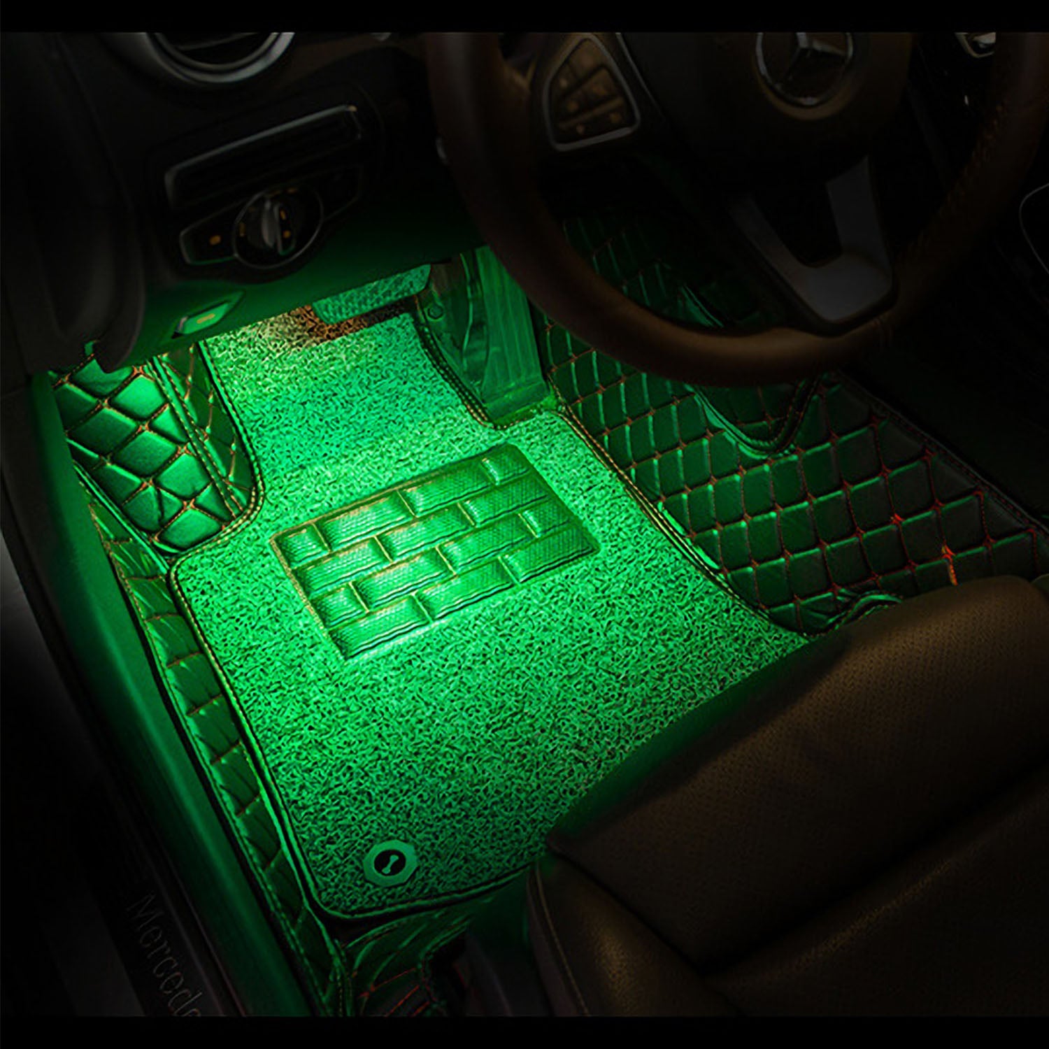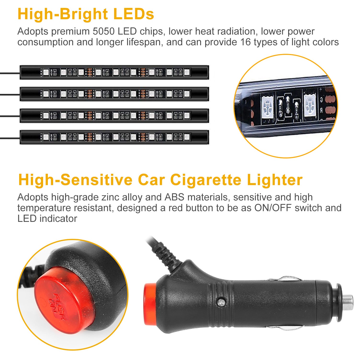 - COOL DECORATIVE ATMOSPHERE LIGHT:Can provide 16 static light colors and 4 light modes(flash,strobe,fade and smooth) with gradient colors to create and render romantic atmosphere for your car interior. Each of our LED light strips adopts 9pcs high-quality 5050 LED chips and package comes with 4pcs flexible LED light strips to meet your needs.