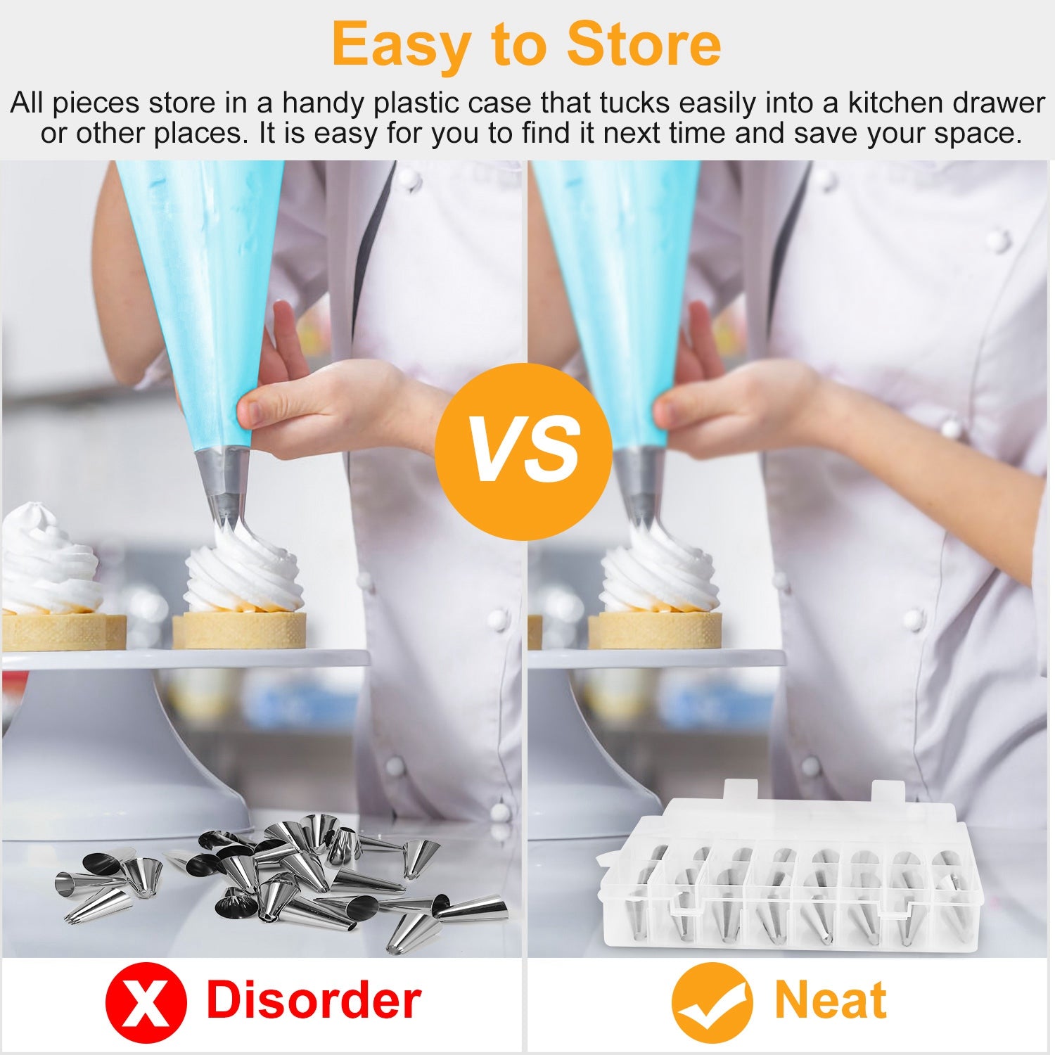 - Easy to Clean & Store:One thin tip brush can make quick work of removing icing from the crevices of the tips and other decorating tools. All pieces store in a handy plastic case that tucks easily into a kitchen drawer or other places. It is easy for you to find it next time and save your space.