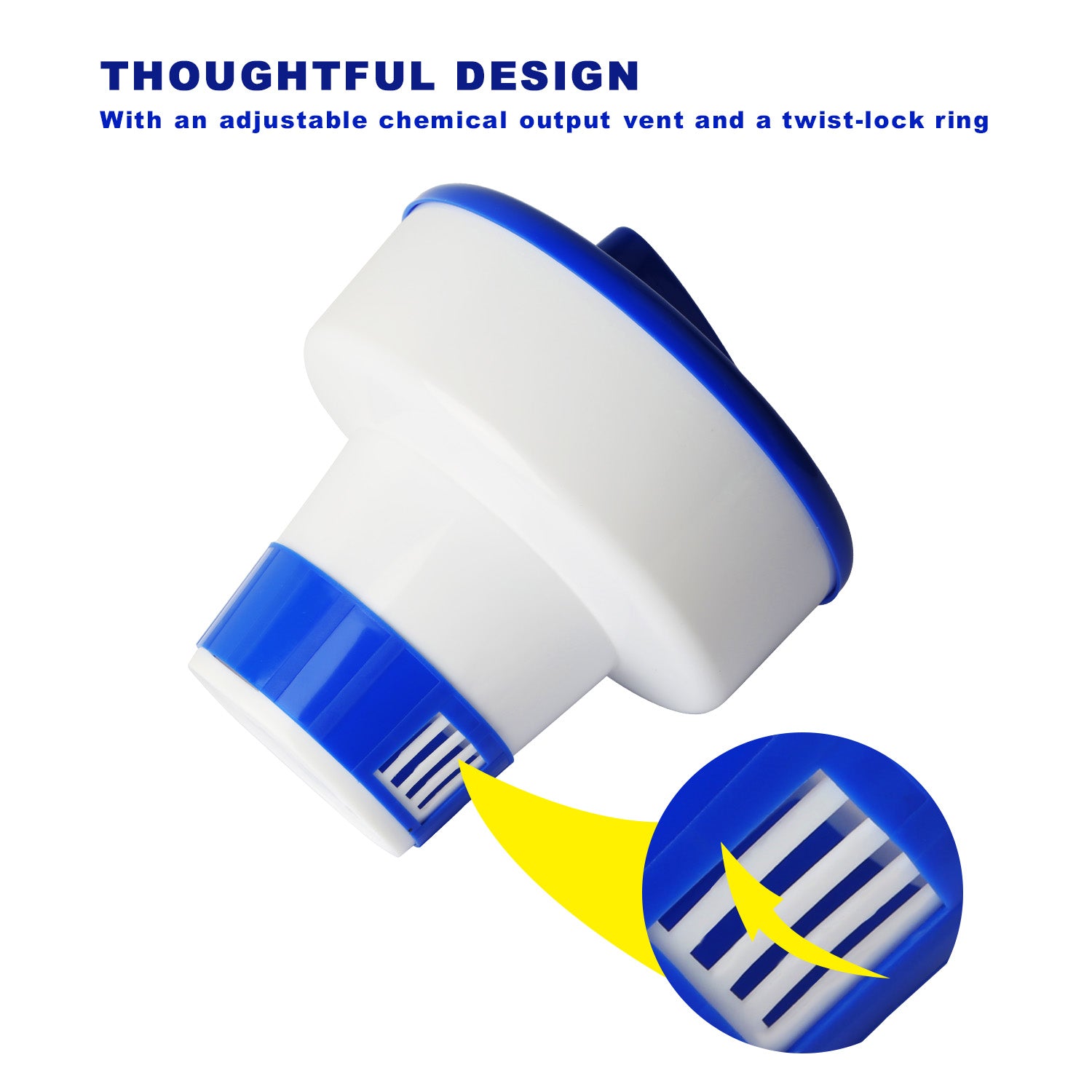 - Controllable Chemical Dosage:Equipped with an adjustable chemical output vent and a twist-lock ring to release the right amount of chlorine.