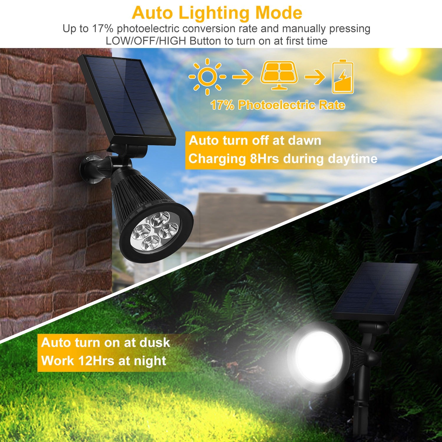 - ULTRA-BRIGHT & 2 LIGHTING MODES:4Pcs upgraded LED beads of Solar spotlight provide a good solution for illuminating at dark. 2 Working modes(Full brightness or dim brightness of spotlight illuminating all night) shift via pressing the switch behind.