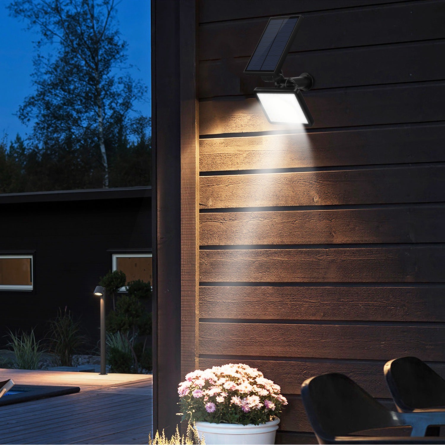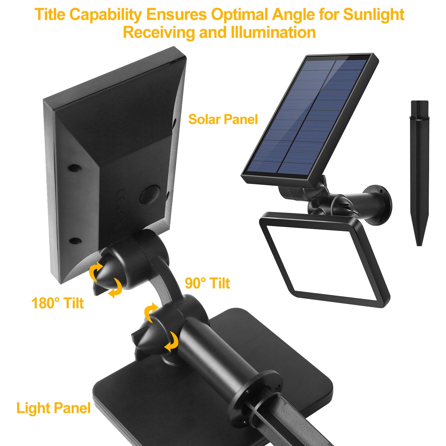 - FLEXIBLE 90°/180° TILT:Solar panel tilts up to 180° and light panel tilts up 90° to ensure maximum sunlight receiving and optimal illumination angle regardless of the installation positions on wall or in ground.