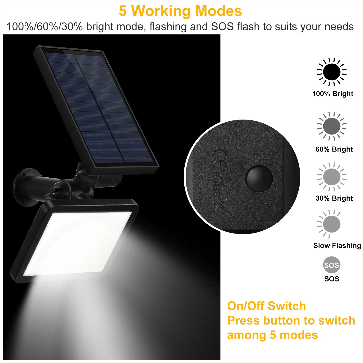 - ULTRA-BRIGHTNESS & 5 WORKING MODES:Built-in upgraded 48 SMD LEDs provides 960lm bright light in 5 modes(100%/60%/30% bright mode,flashing and SOS signal). 5 lighting modes shift via pressing ON/OFF button.
