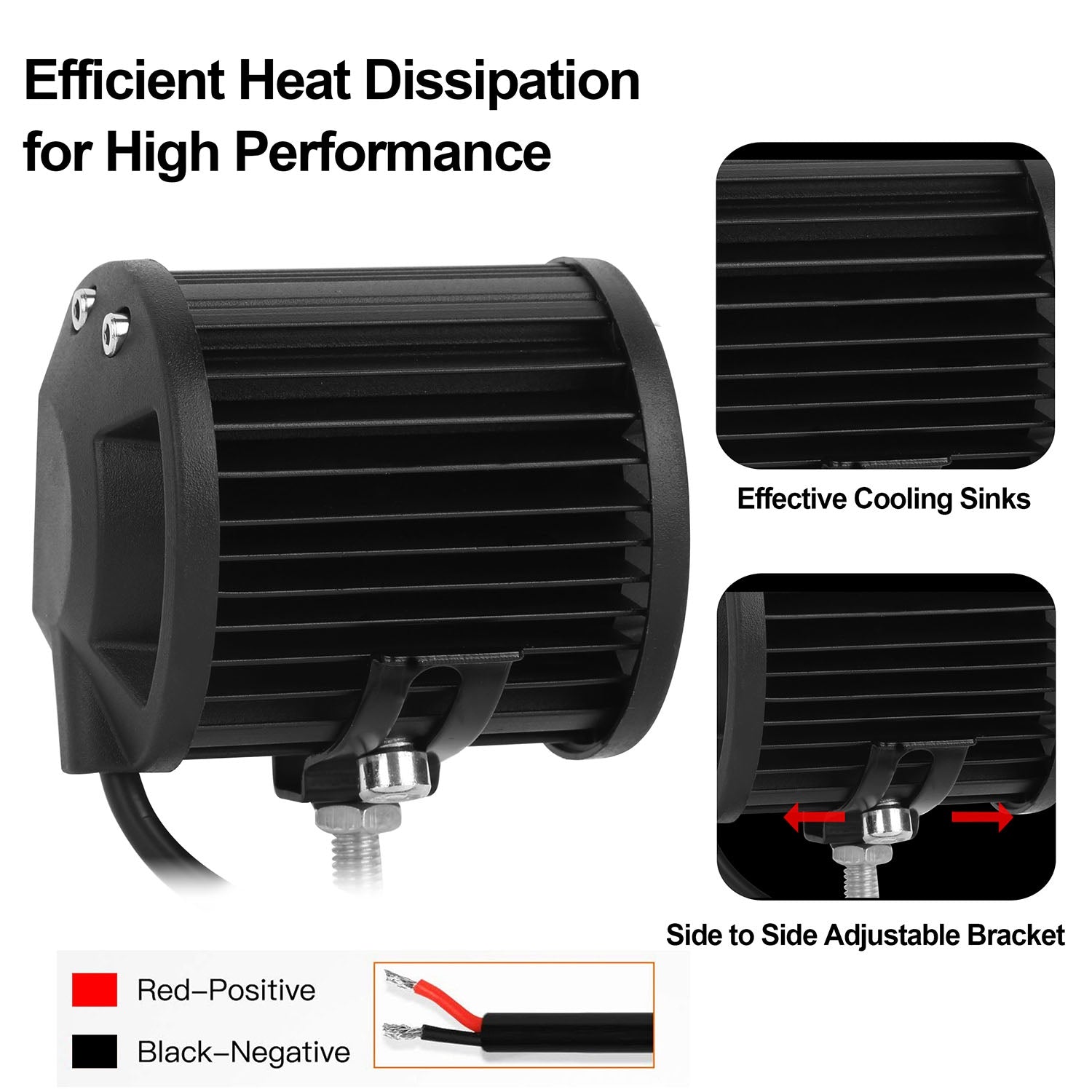 - Efficient Heat Dissipation:For better performance and durability,these spot lights provide effective dissipation through the fin shaped sink area at the back of each light where it comes into contact with your vehicle. Good dissipation helps to keep to lights cool and extend the lifespan of LEDs to over 30,000 hours.