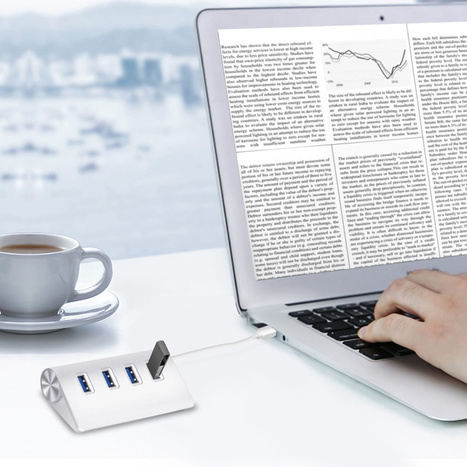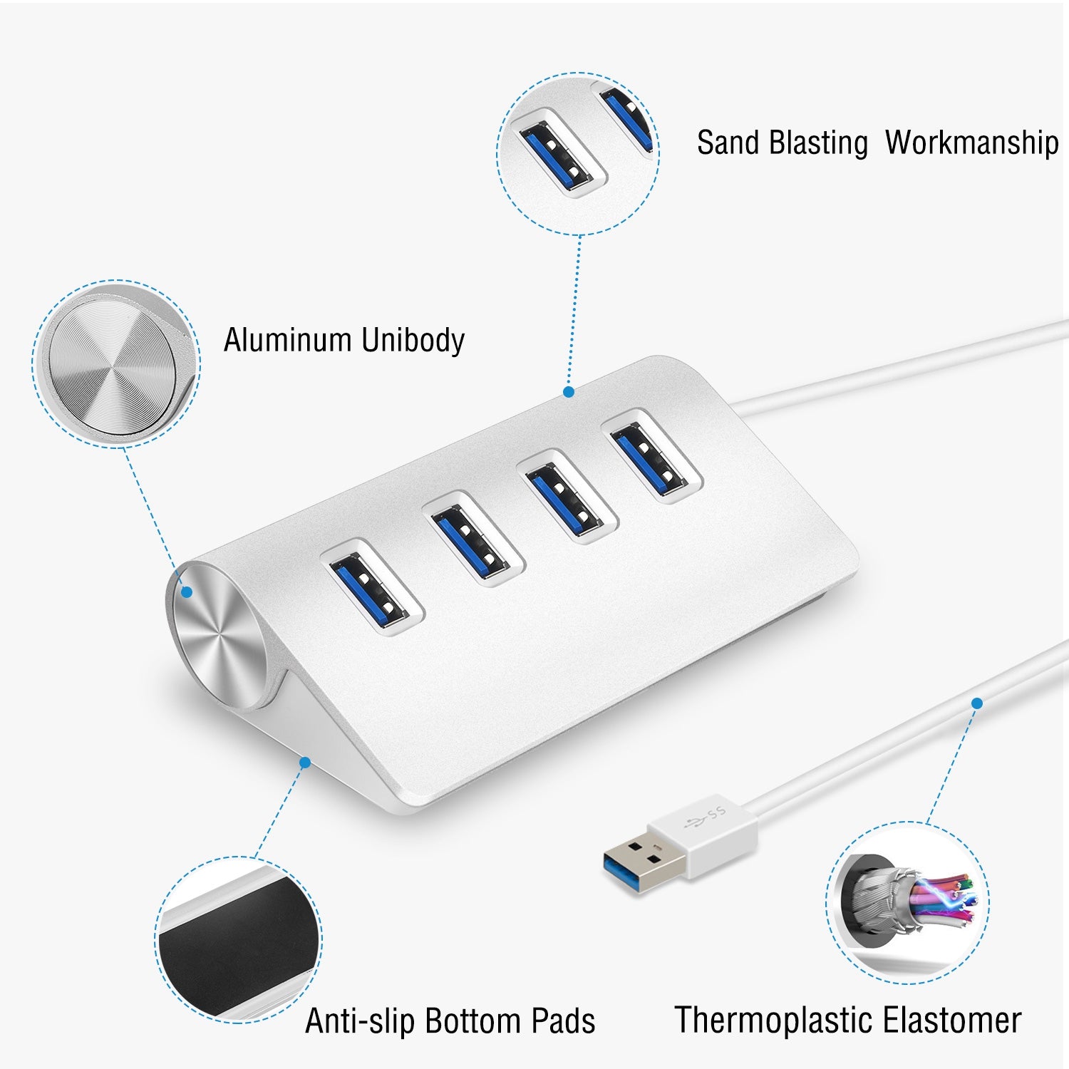 - HEAVY DUTY ALUMINUM ALLOY:Our USB 3.0 hub adopts aluminum alloy material and abrasive surface treatment;features with durableness and good heat releasing. Black bottom pad is free from slip.