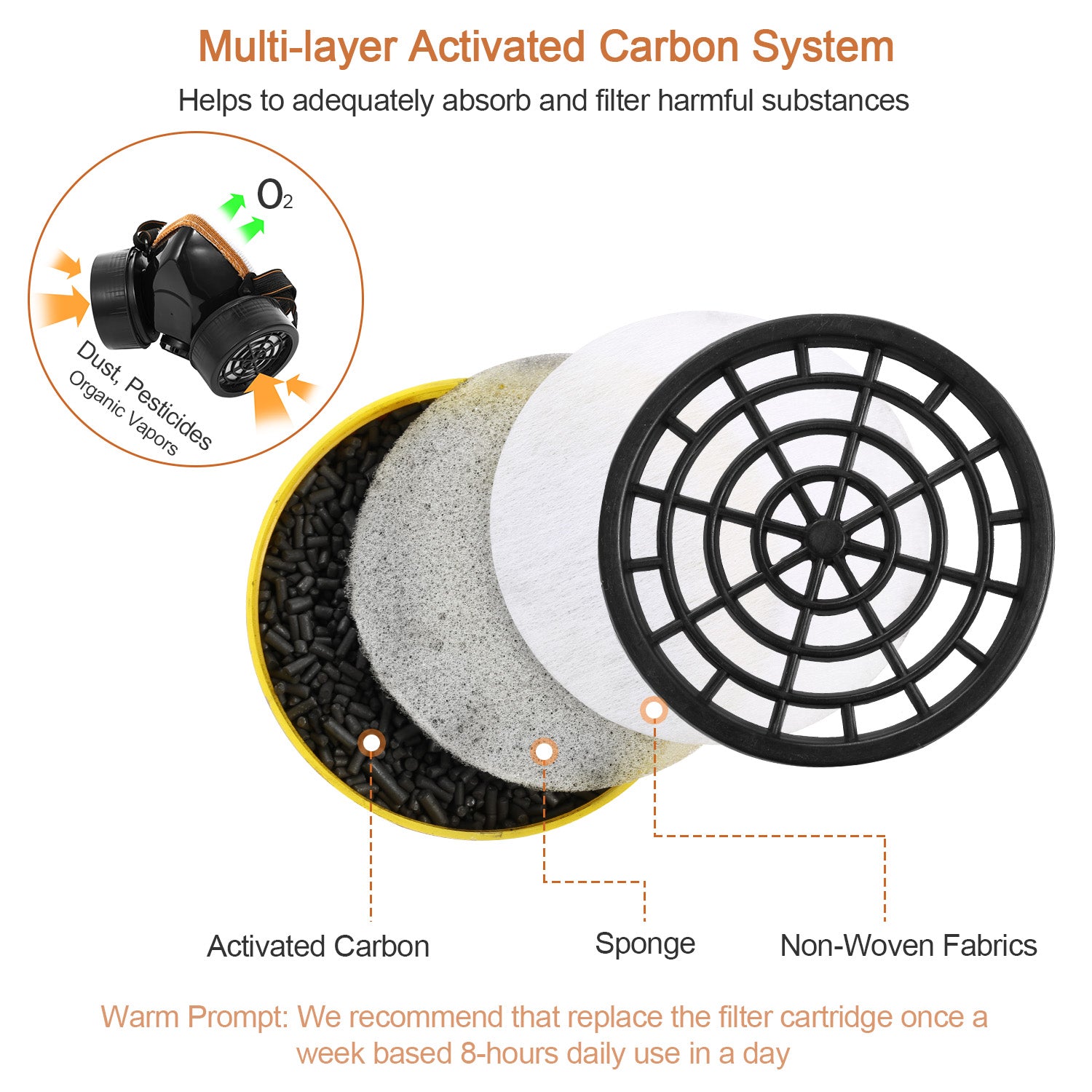 - Dual Strong Filter Cartridge:The dual filter cartridge increases filter area than one filter,thus reducing breathing resistance. And the multi-layer activated carbon inside filter cartridge helps to adequately absorb and filter harmful substances,perfect for agriculture,industry and scientific research units’ use.