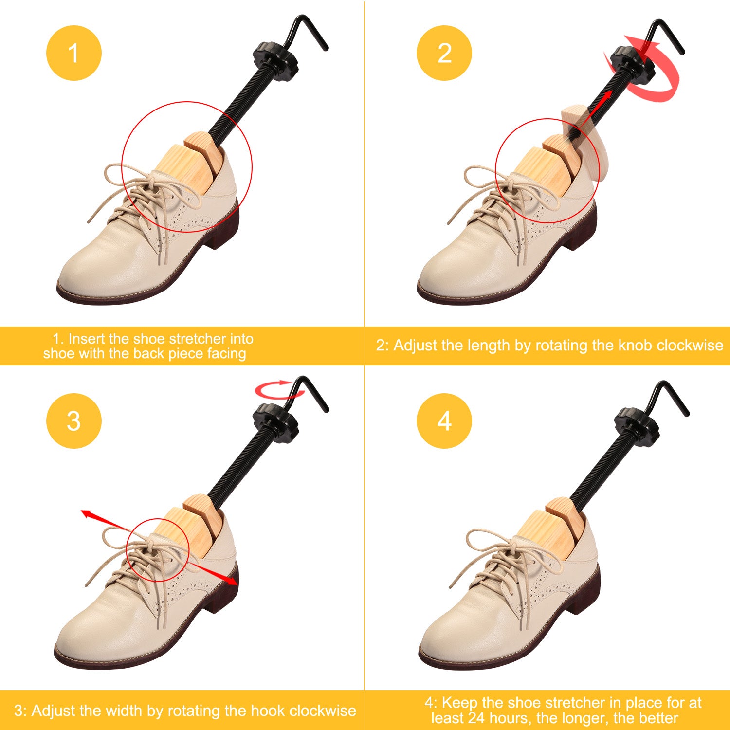 - Easy to Use:Just insert the shoe stretchers into the shoes,and then rotate the knob clockwise to stretch the length of the shoes and rotate the hook clockwise to stretch the width of the shoes. The longer the shoe stretcher is inside,the more your shoes will stretch.
