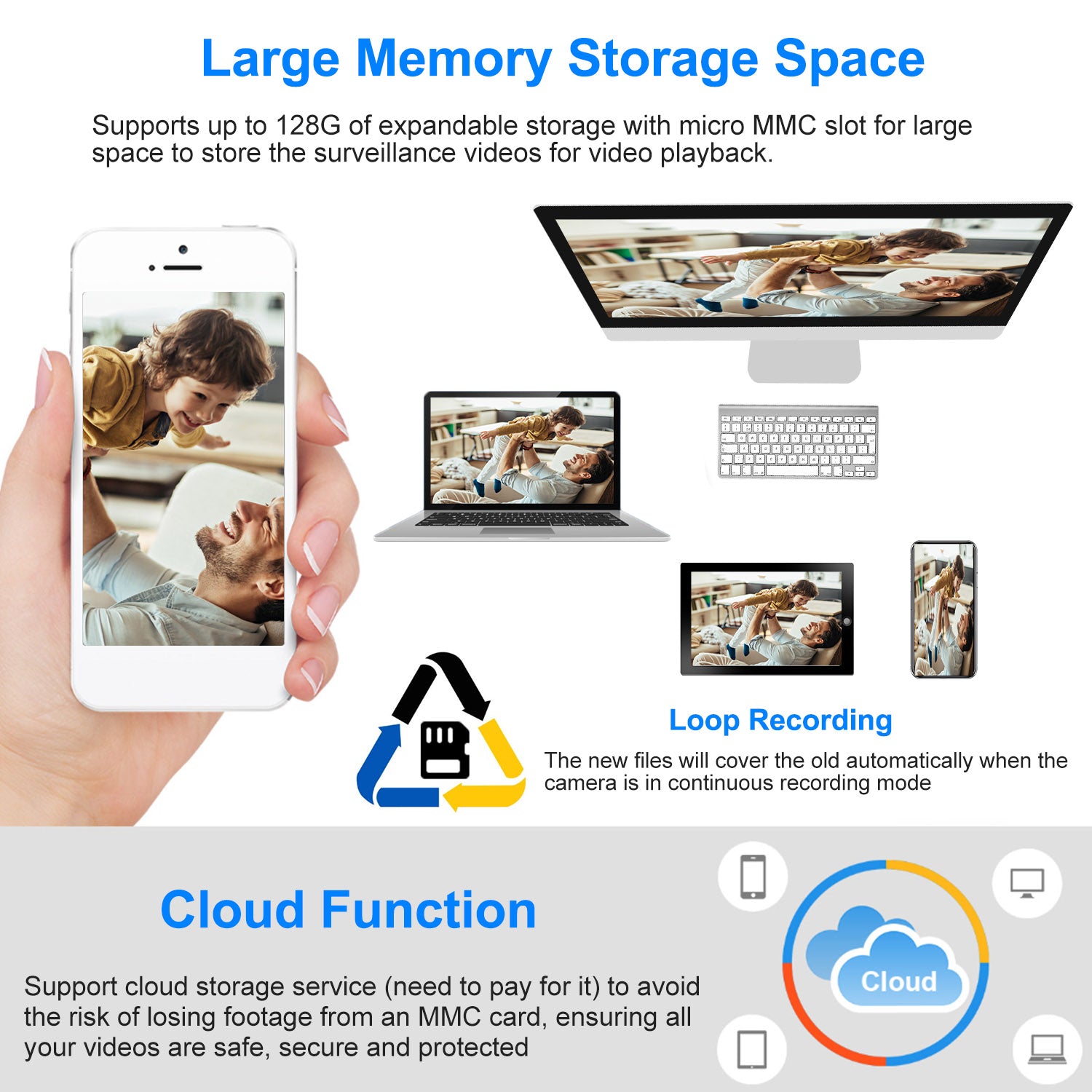 - Widely Use and Large Memory Storage Space:The reliable WiFi connectivity(2.4G WiFi Only) to access your camera via the YI IoT App on your iOS or Android mobile devices and easily achieve P2P(Point to Point) monitor or view by smartphone/Tablet PC anytime and anywhere. Moreover,it supports up to 128G of expandable storage with MMC slot for large space to store the surveillance video for video playback and cloud storage service(need to pay for it) to avoid the risk of losing footage from an MMC card,ensuring all your videos are safe,secure and protected. Note:Supports max 128GB MMC card(MMC card is not included).
