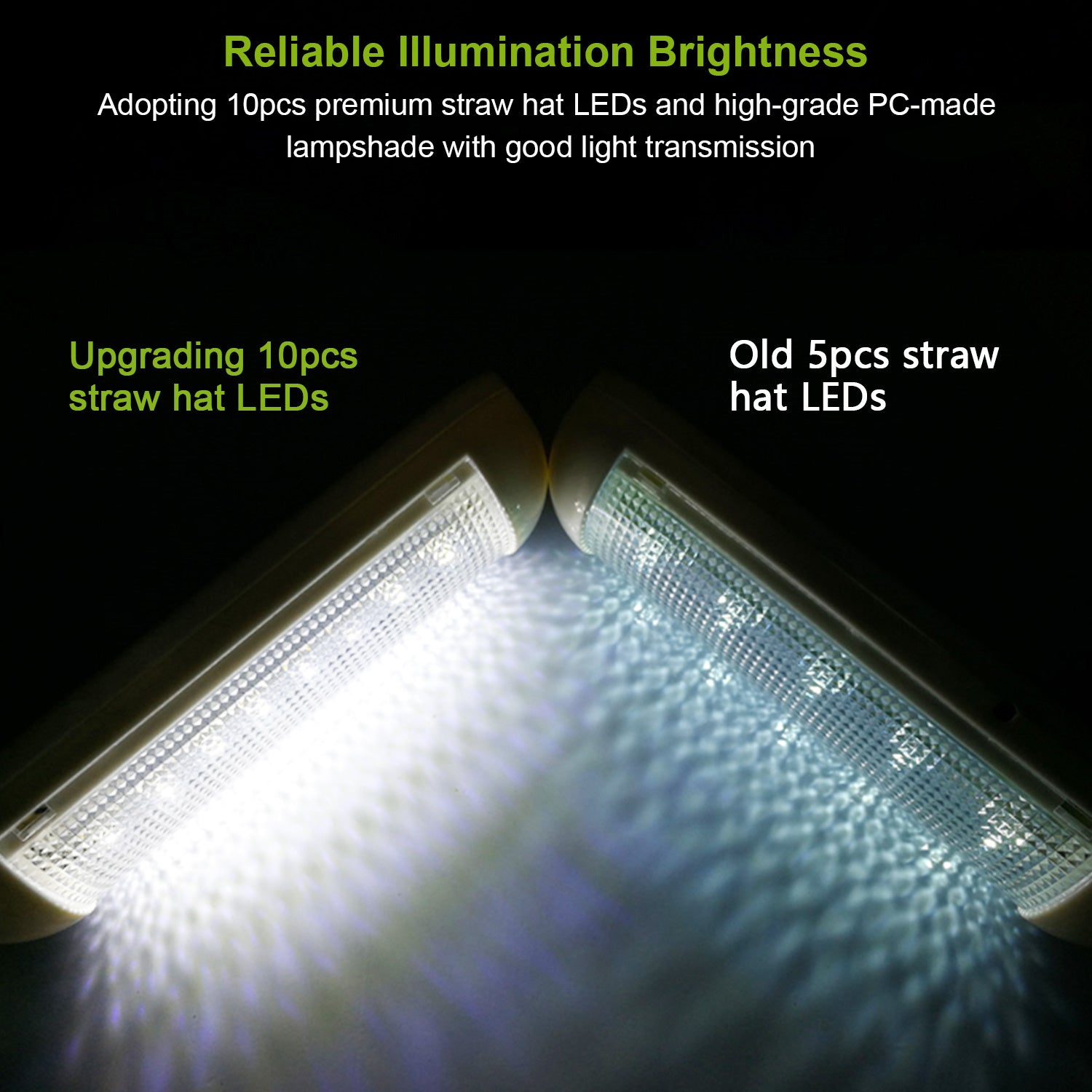 - Reliable Illumination Brightness:Adopting 10pcs premium straw hat LEDs and high-grade PC-made lampshade with good light transmission,our brightness of our upgrading LED light is much lighter than the old one inbuilt 5pcs straw hat LEDs.(Note:The brightness of our LED light is better for the illumination of shed,garage,store room and tool room or some emergency illuminations,reading or something like that are not recommended.)
