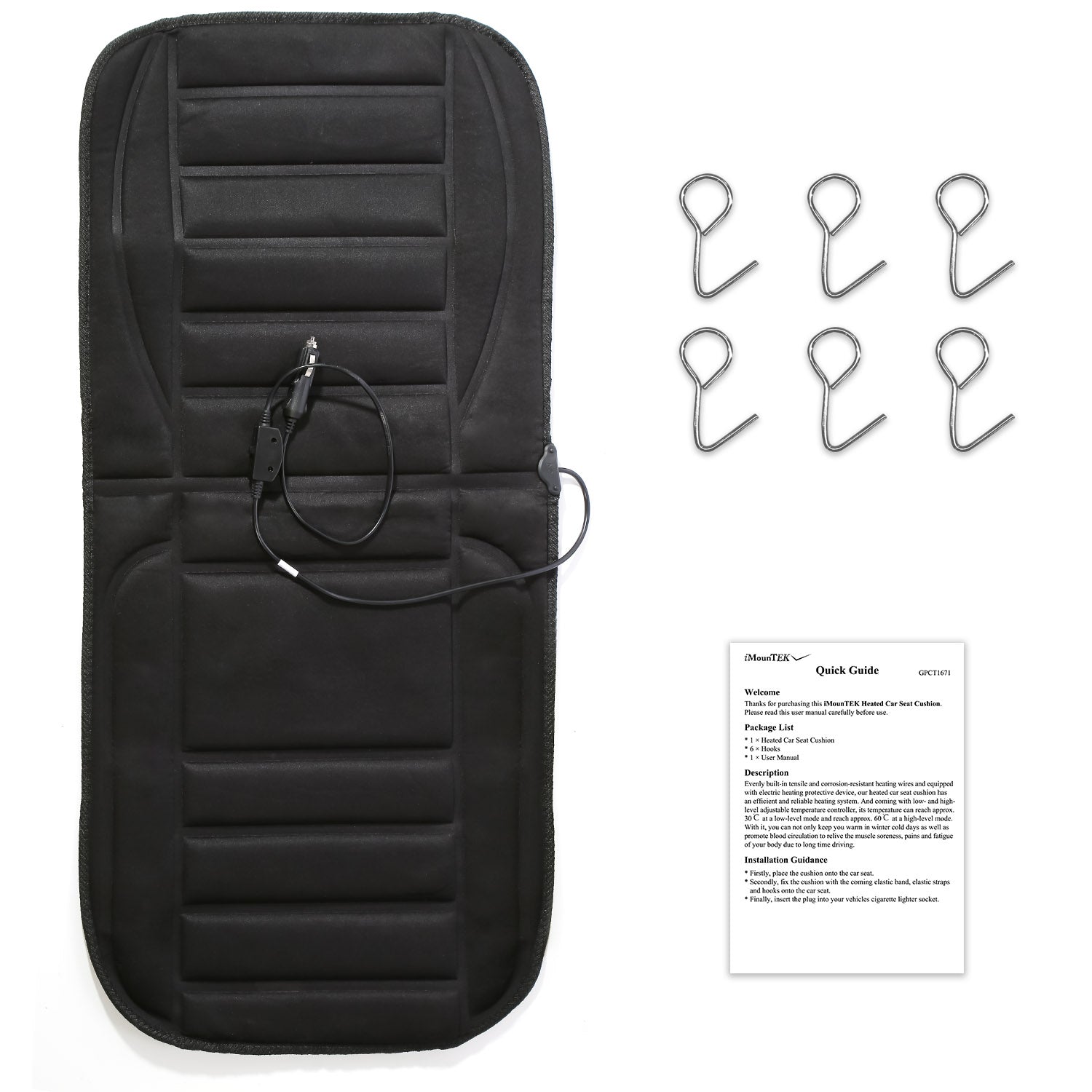- Easy to Install and Universal Fits:Simply place the cushion onto the car seat and fix it with the coming elastic band,elastic straps and hooks onto the car seat. Once the cushion is secure,insert the plug into your vehicles cigarette lighter socket. Our heated car seat cushion works well with all cars,trucks,vans,SUV's and RV's with a 12V lighter outlet.