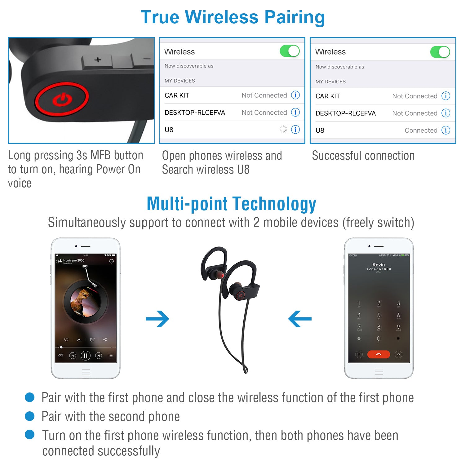 - Crystal Clear Sound:Latest Wireless 4.1version with multi-point technology,simultaneously connect with 2 mobile devices with high quality and high speed signal transmitting,offering impressive crystal clear stereo sound with the 32.8ft maximum distance connectivity. Adopt high-sensitive microphone with CVC noise cancellation technology to reduce ambient noise,grasp the details of voice and offer crystal clear sound even in a noisy environment.