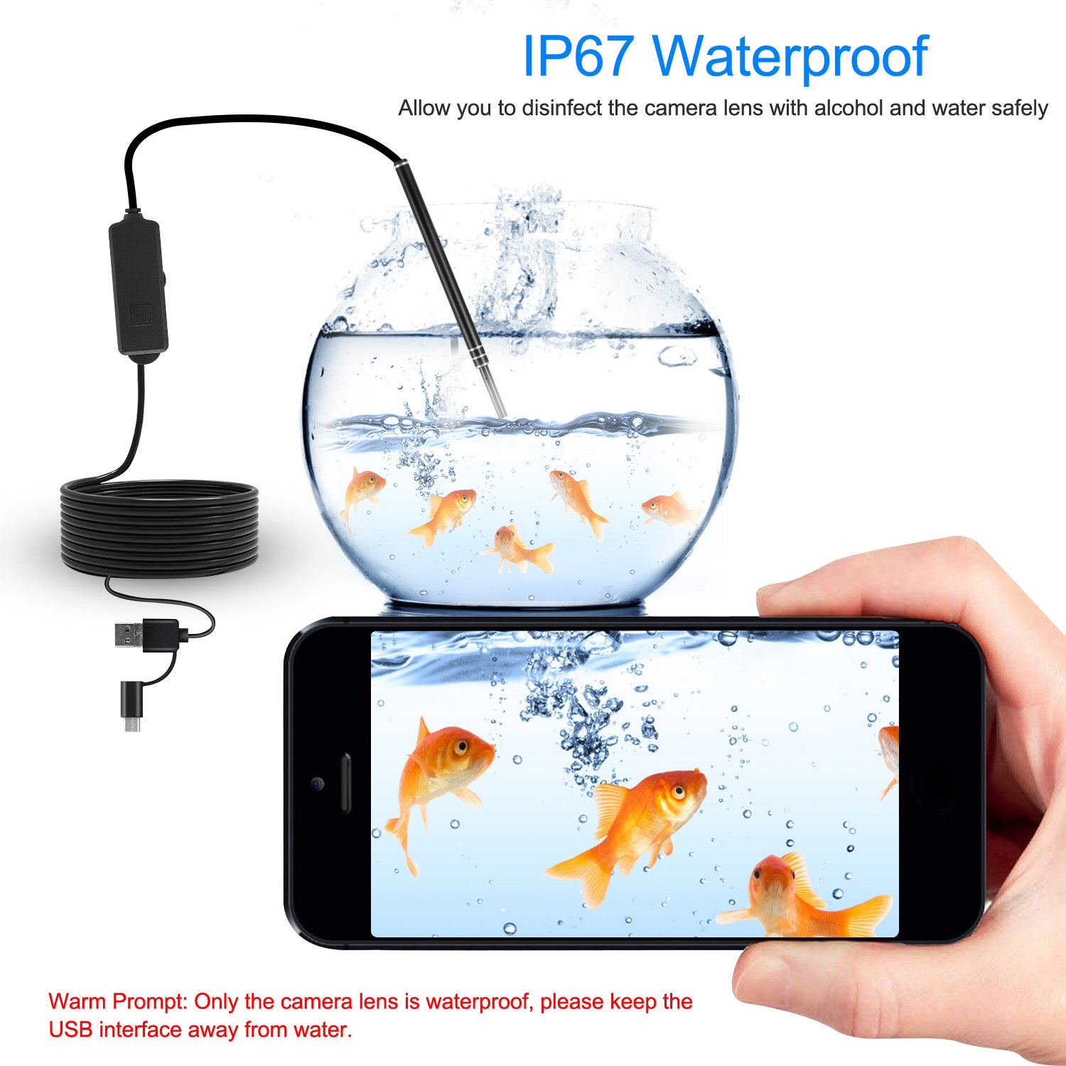 - IP67 Waterproof:IP67 waterproof performance makes the endoscope inspect wet or damp area safely. Please remember that only the camera lens is waterproof,keeping the USB interface away from water.