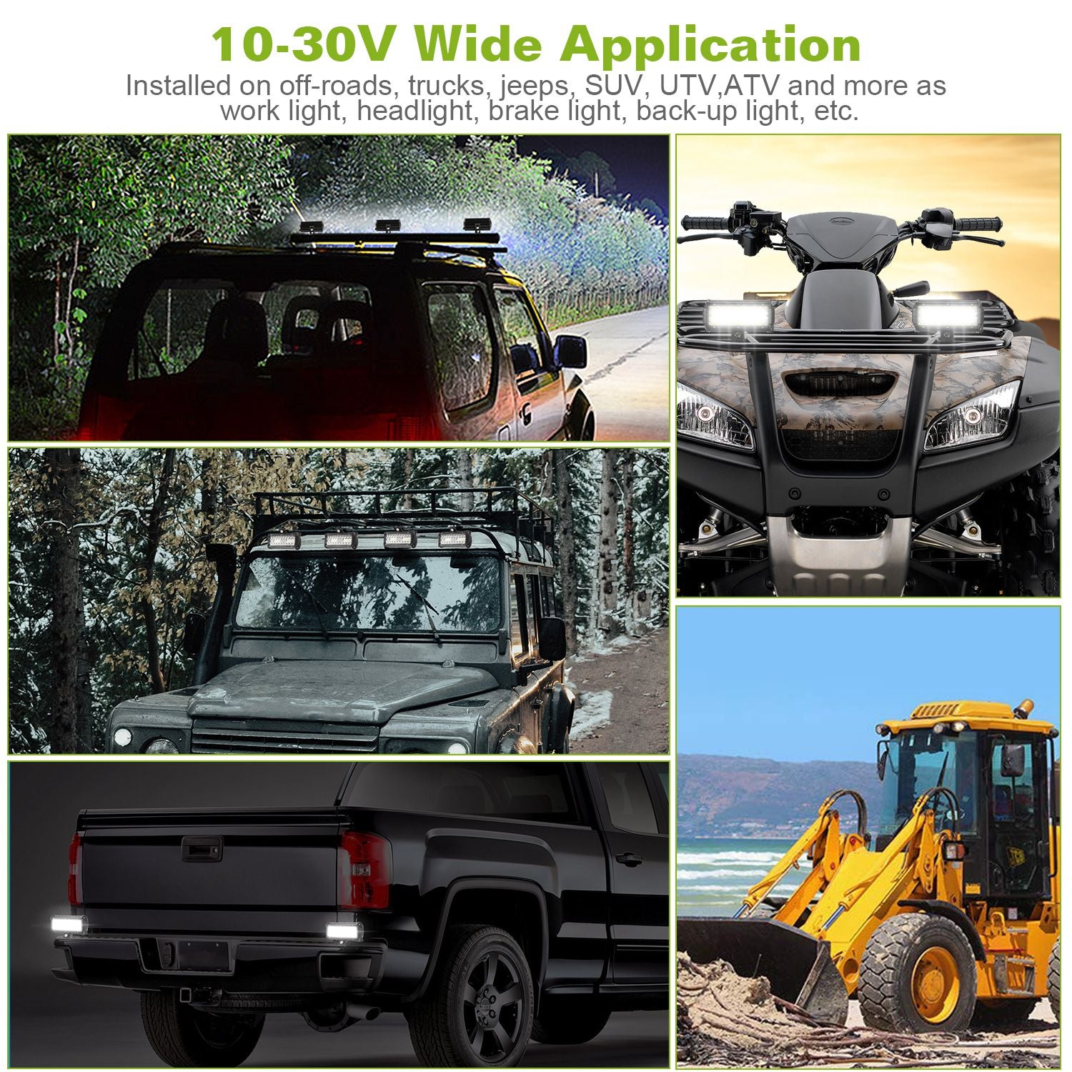 - Wide Application:Can be used as work light,headlight,brake light,back-up light,etc. installed on various types of off-roads,trucks,jeeps,SUV,UTV,ATV,boats,etc. working with 10-30V DC voltage.