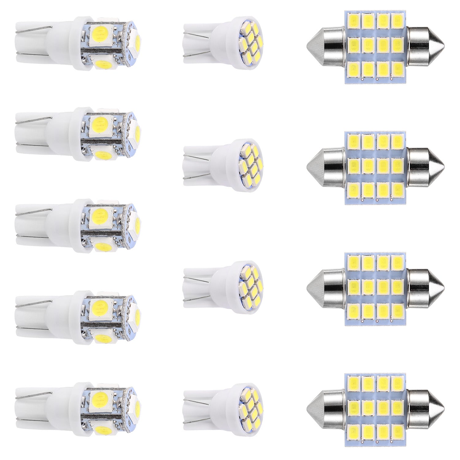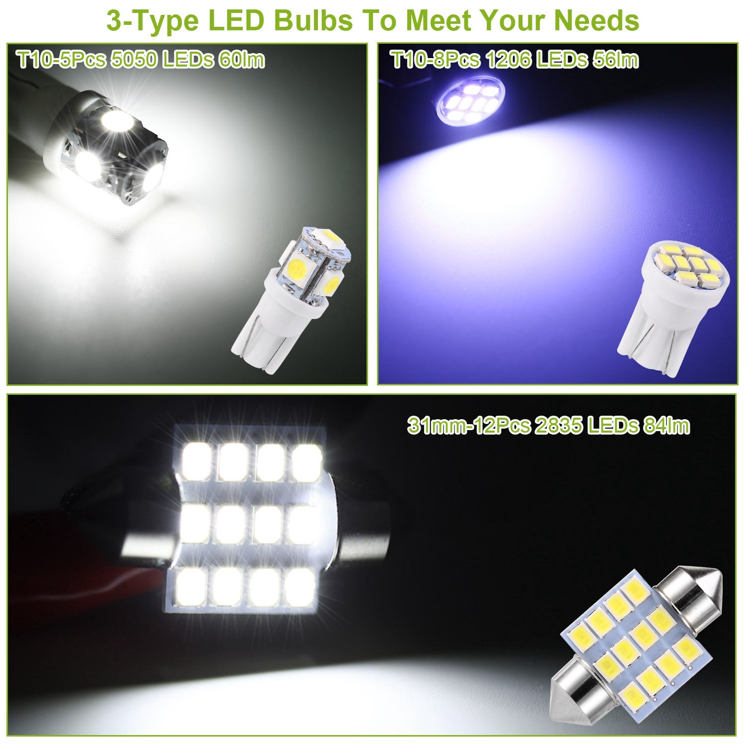- Economical Festoon LED Interior Light Kit:Including total 13pcs festoon LED light bulbs(5pcs T10 5050 5LEDs bulbs,4pcs T101206 8LEDs bulbs and 4pcs 31mm 2835 12LEDs bulbs) to snugly replace your original dim light bulbs and make your car interior brand new.