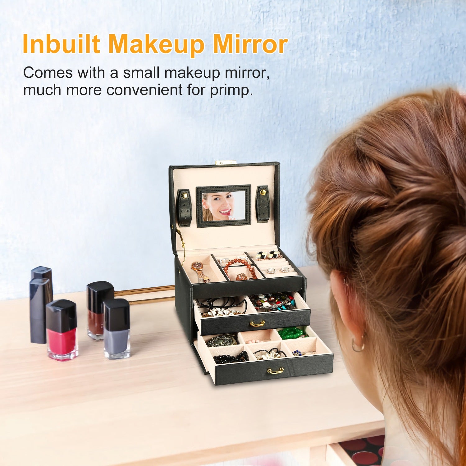 - **POTABLE MULTIPURPOSE CASE*: Handle on the top makes the jewelry case portable, and allows you to take it wherever you want. And the removable compartment and drawer with practical divisions for various pieces of jewelry such as rings, earrings, and chains, close it with a press button, it quickly transforms into a small travel case.