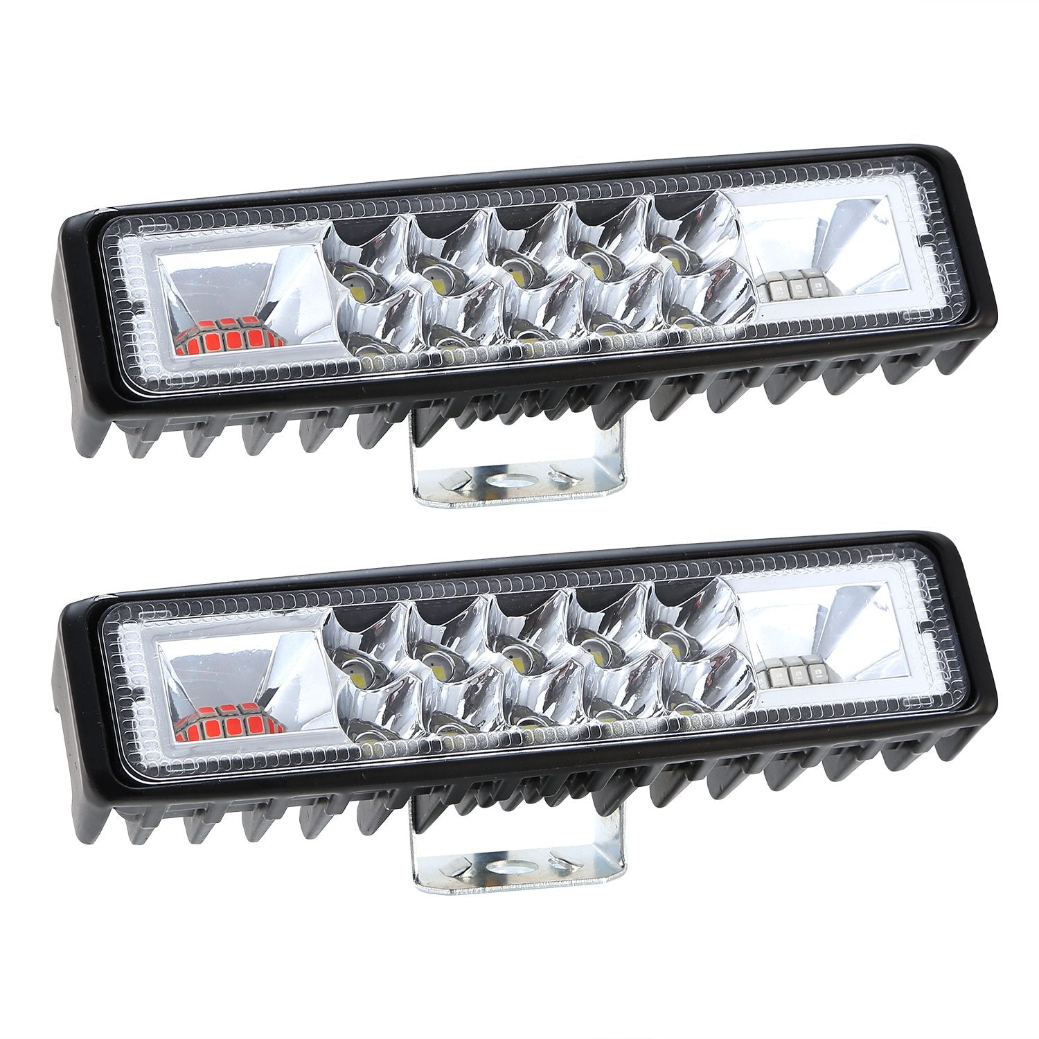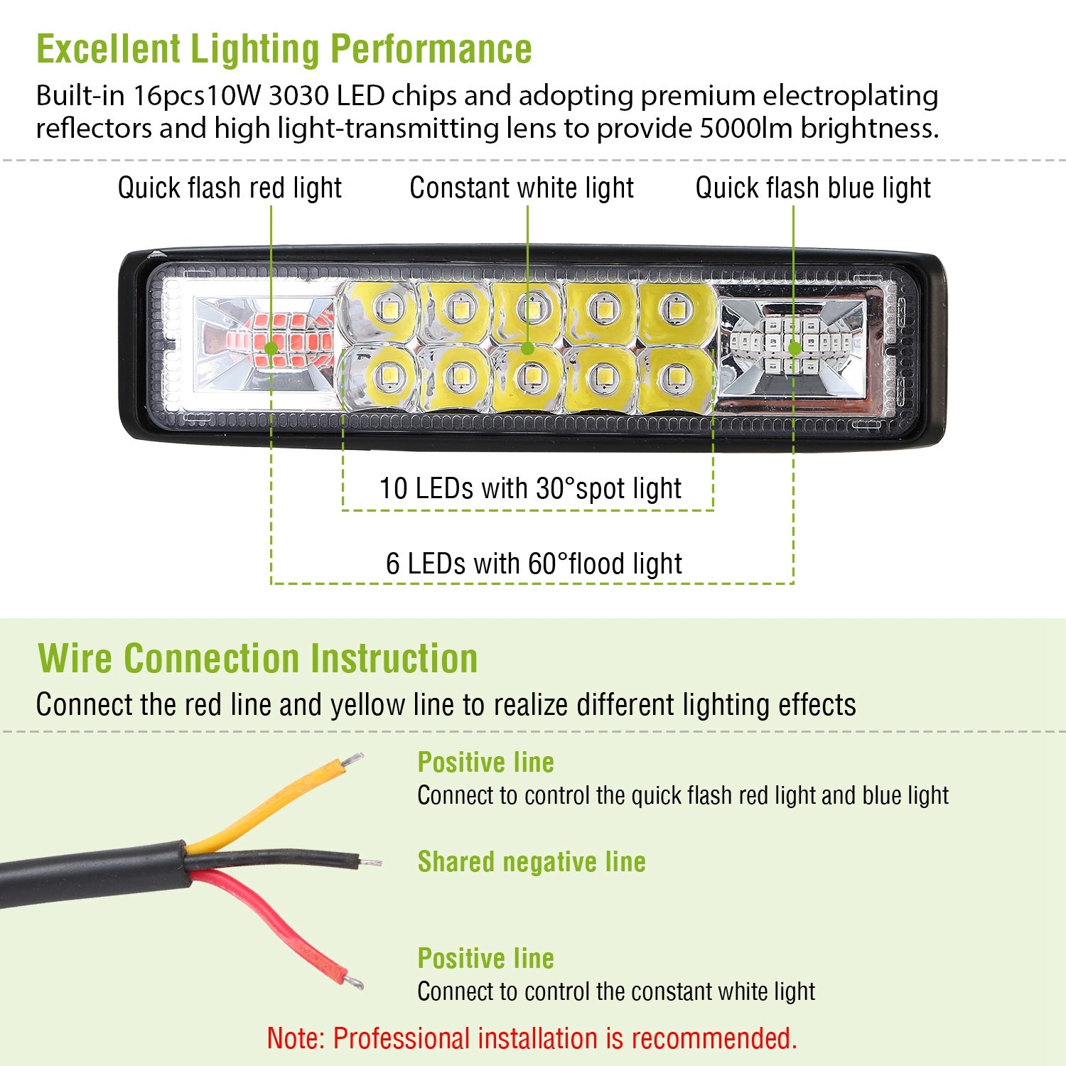 - EXCELLENT LIGHTING PERFORMANCE:Built-in 16pcs 3W 3030 LED chips and adopting premium electroplating reflectors and high light-transmitting lens to provide 5000lm brightness. And in addition to the constant white illumination light(10 LEDs) in the middle,it is especially designed flash red light(3 LEDs) and blue light(3 LEDs) to play an significant role in warning vehicles,pedestrians,etc.