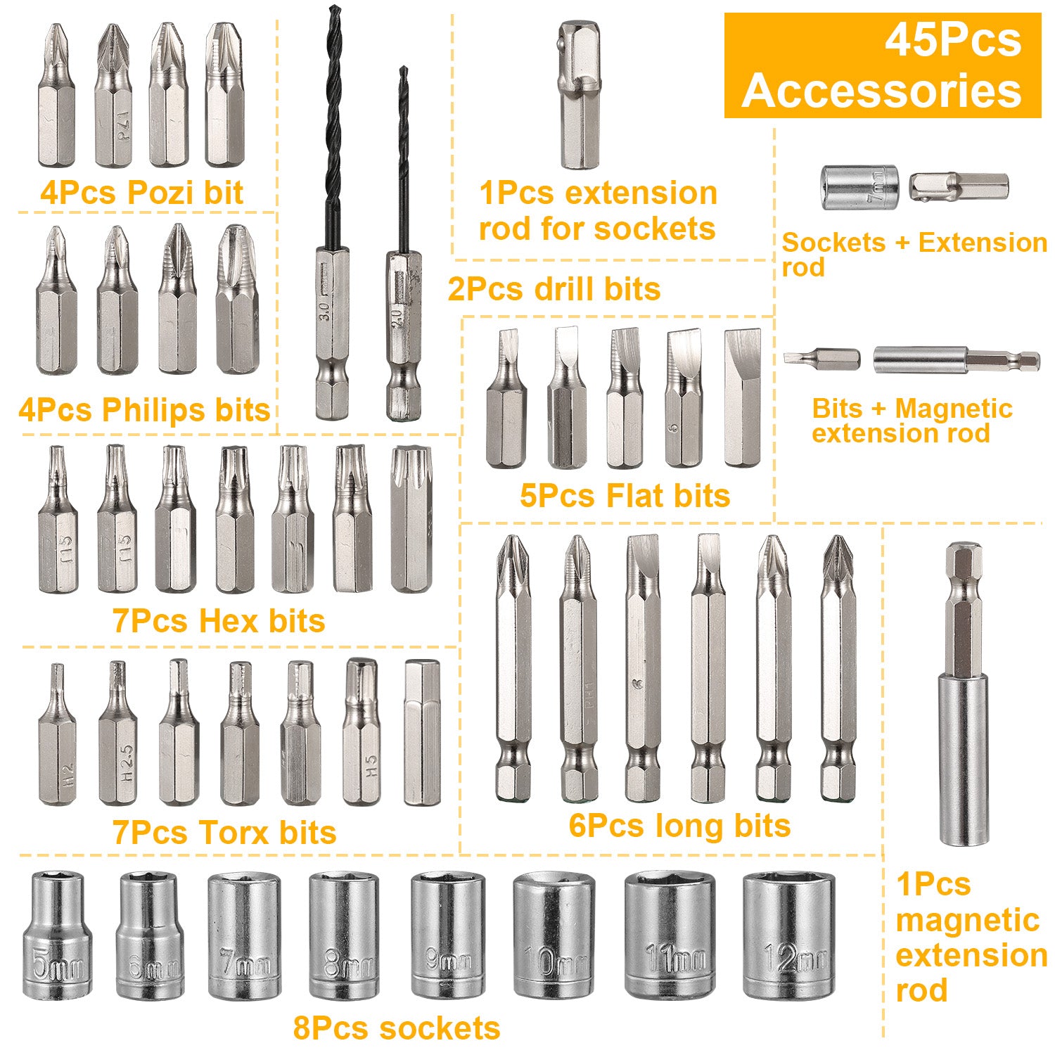 - ** 45PCS ACCESSORIES*:Including 4pcs Philips bits(PH0,PH1,PH2 and PH3),4pcs Pozi bits(PZ0,PZ1,PZ2 and PZ3),5pcs Flat bits(3,4,5,6 and 7),7pcs Torx bits(T10,T15,T20,T25,T27,T30 and T40),7pcs Hex bits(H2,H2.5,H3,H3.5,H4,H5 and H6),2pcs long Philips bits((PH1 and PH2),2pcs long Pozi bits(PZ1 and PZ2),2pcs long flat bits(4 and 6),2pcs drill bits(HSS2.0 and HSS3.0),8pcs sockets(5,6,7,8,9,10,11 and 12mm),1pcs extension rod for sockets and 1pcs magnetic extension rod for all bits.