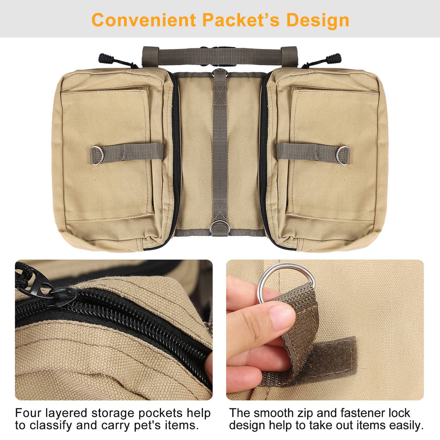 - ** MULTI-POCKET & LARGE STORAGE SPACE*:2 large zipper compartments with 2 semi-open smaller packets provide enough space to carry dog food holder, water, snacks, poop bags, first aid, etc. Layered packets help to hold and take out items easily. No worry about falling off.