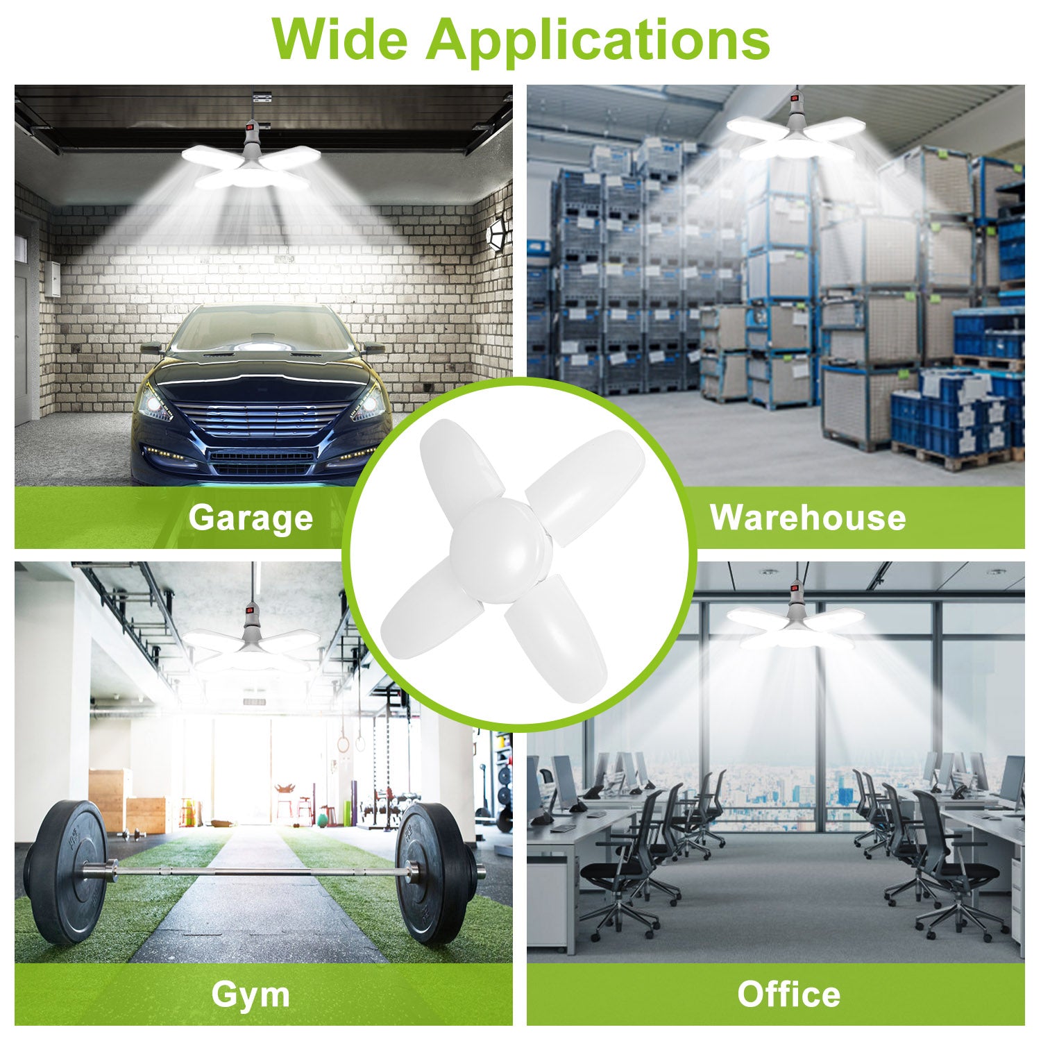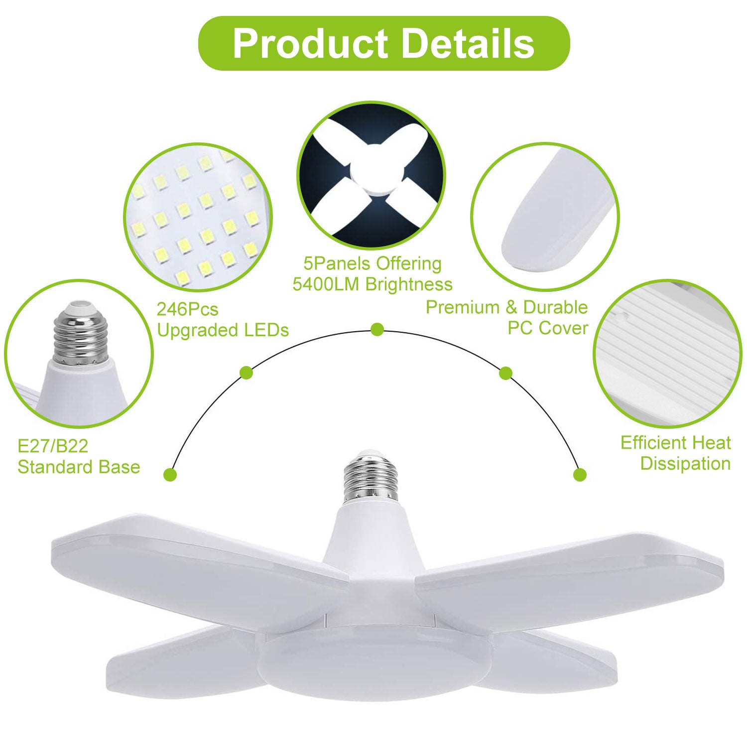 - 5400LM ULTRA HIGH BRIGHTNESS:Comes with 5400 lumens and total 246pcs upgraded LED chips,our garage light is bright enough to light up the large area from every angle. Much brighter than the traditional incandescent light bulbs’. No need to fumble in darkness anymore.