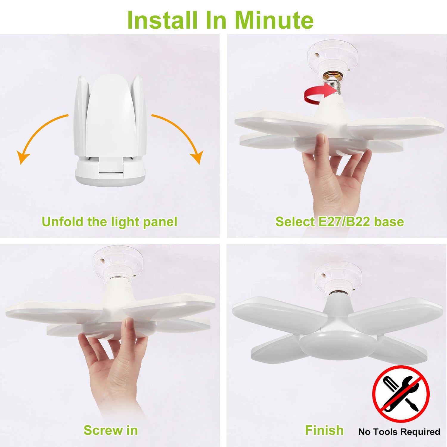 - E27/B22 BASE & EASY INSTALLMENT:85-265V Wide input voltage,just plug in E27/B22 light bulb base,no tools required,no wiring and no professional electricians required. Widely used for garage,warehouse,basement,workshop,barn,corridor,office,exhibition area,stadium,gym,etc..