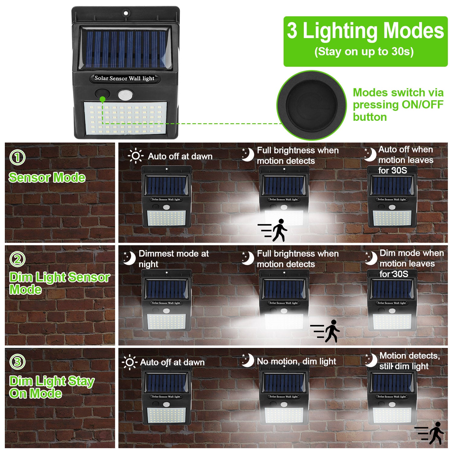 - **3 Lighting Modes*:Mode 1: Full brightness when motion detects at night; Mode 2: Turns from dimmest light to full brightness when motion detects at night; Mode 3: Constant dim light at night. 3 Lighting modes switch through pressing ON/OFF button.