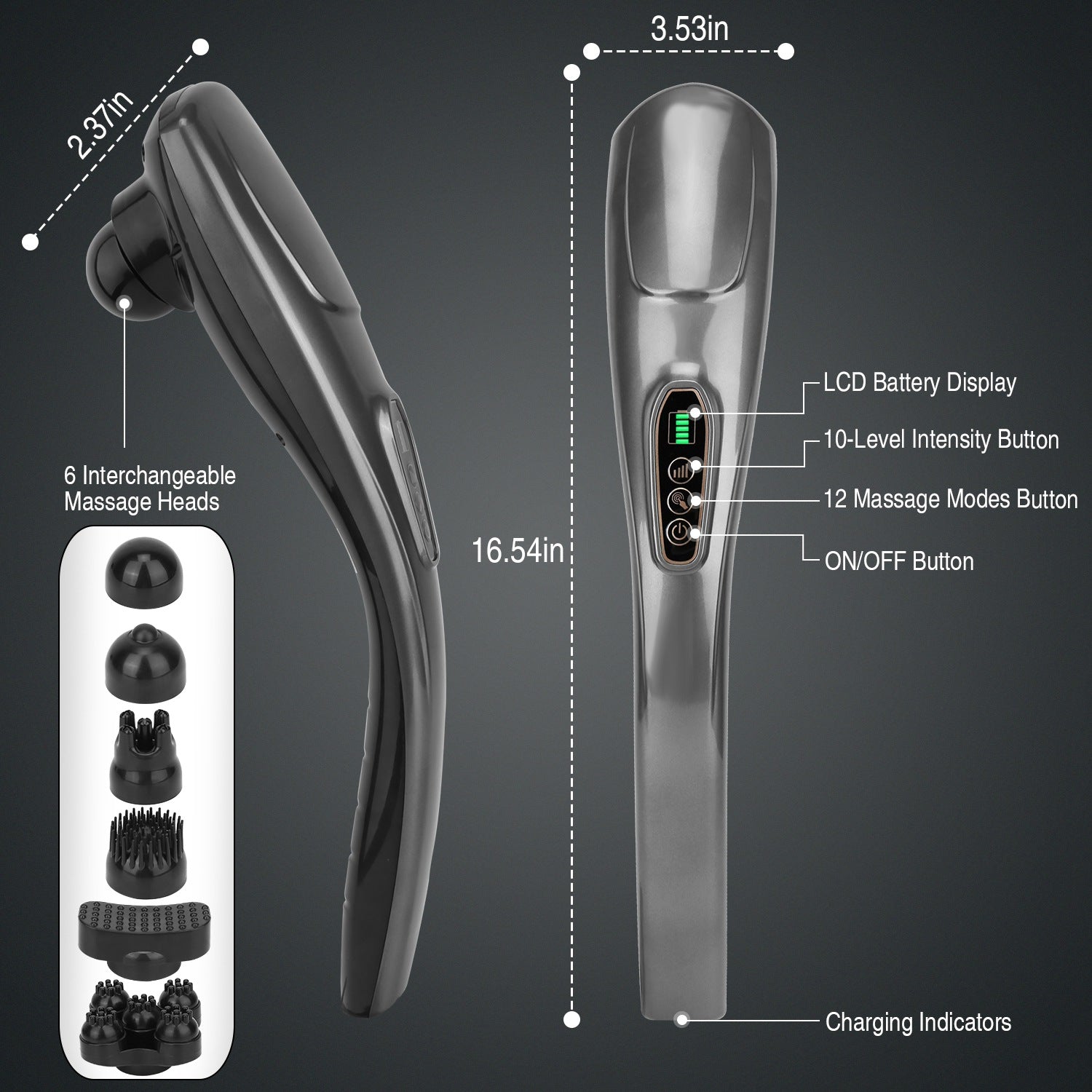 - **6 INTERCHANGEABLE MASSAGE HEADS*:Switch among 6 massage heads of different shapes, well promoting stress relief with full body massage on body parts,such as back, foot,arm, muscle, leg, calf, neck, shoulder, elbow, thigh, also has proven to improve blood circulation.