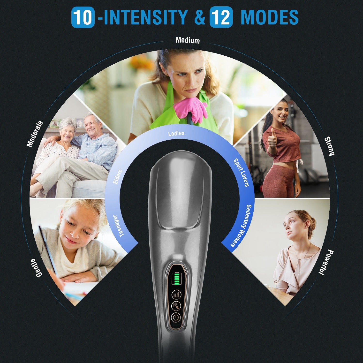 - **12 MASSAGE MODES & 10 LEVELS INTENSITY*:Featured with 10 variable speeds and 12 vibration modes offer gentle and intense massage. Effectively ease muscle soreness and speed up recovery. After working 15 minutes, it will shut off automatically to prevent the machine from overheating.
