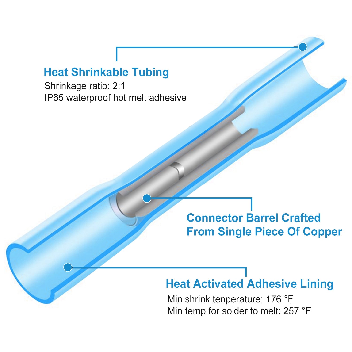 - Blue Shrink Connectors: Diameter of Copper Pipe: 2.26mm, Inner Diameter of Heat Shrink Tube: 5.67mm, Cable Cross-section: 1.5-2.5 mm²(A.W.G:16-14)