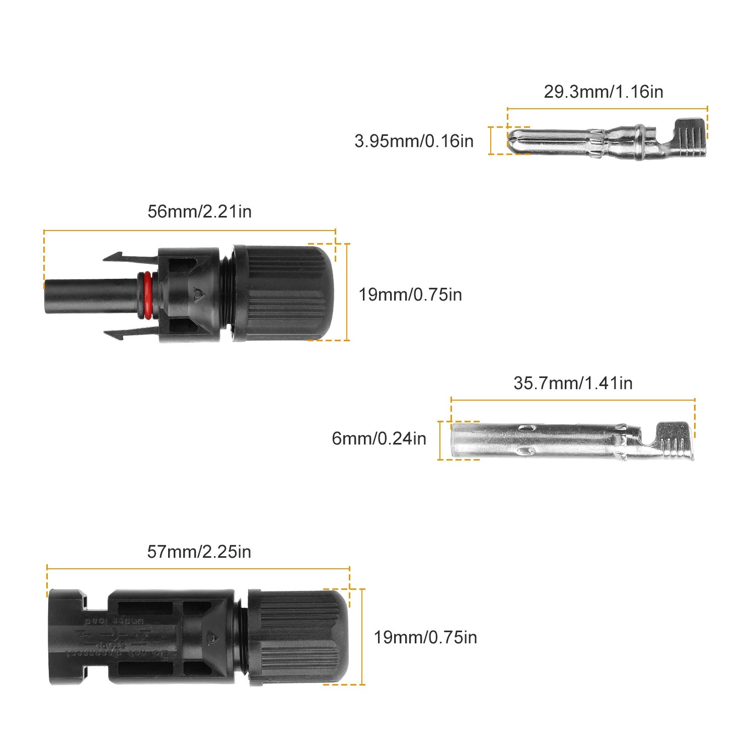 - *Solar Male/Female Connector: Comes with 10 pairs solar panel connector (10pcs male & 10pcs female), which is compatible with different insulation diameters.