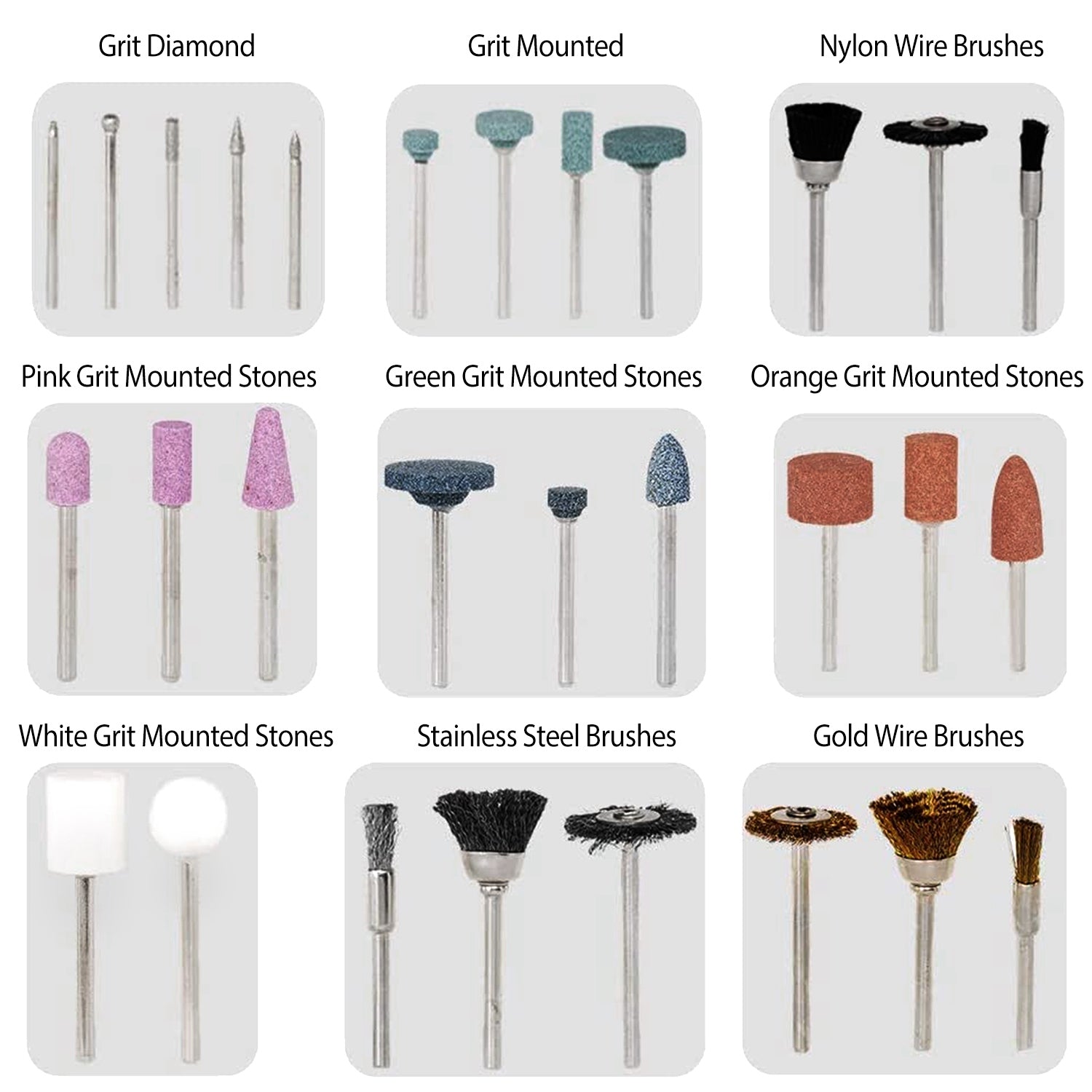 - *228pcs Set*:The Kit includes:Sanding Bands, Mounted Rubber Mandrels for Sanding Bands, Fiber Glass Cut-Off Wheels, Pink Aluminum Oxide Wheel, Green Aluminum Oxide Wheel, Rubber Polishing Wheel, Big Soft Polishing Woolen Wheels, Small Soft Polishing Woolen Wheels, Hard Polishing Woolen Points, Red Cut-Off Wheels, Black Cut-Off Wheels, Stainless Steel Brush, Nylon Wire Brush, Mounted Abrasive Stones, Diamond Burrs, HSS Burrs/Drills, Screw Mandrel, Mandrel, Polishing Paste.