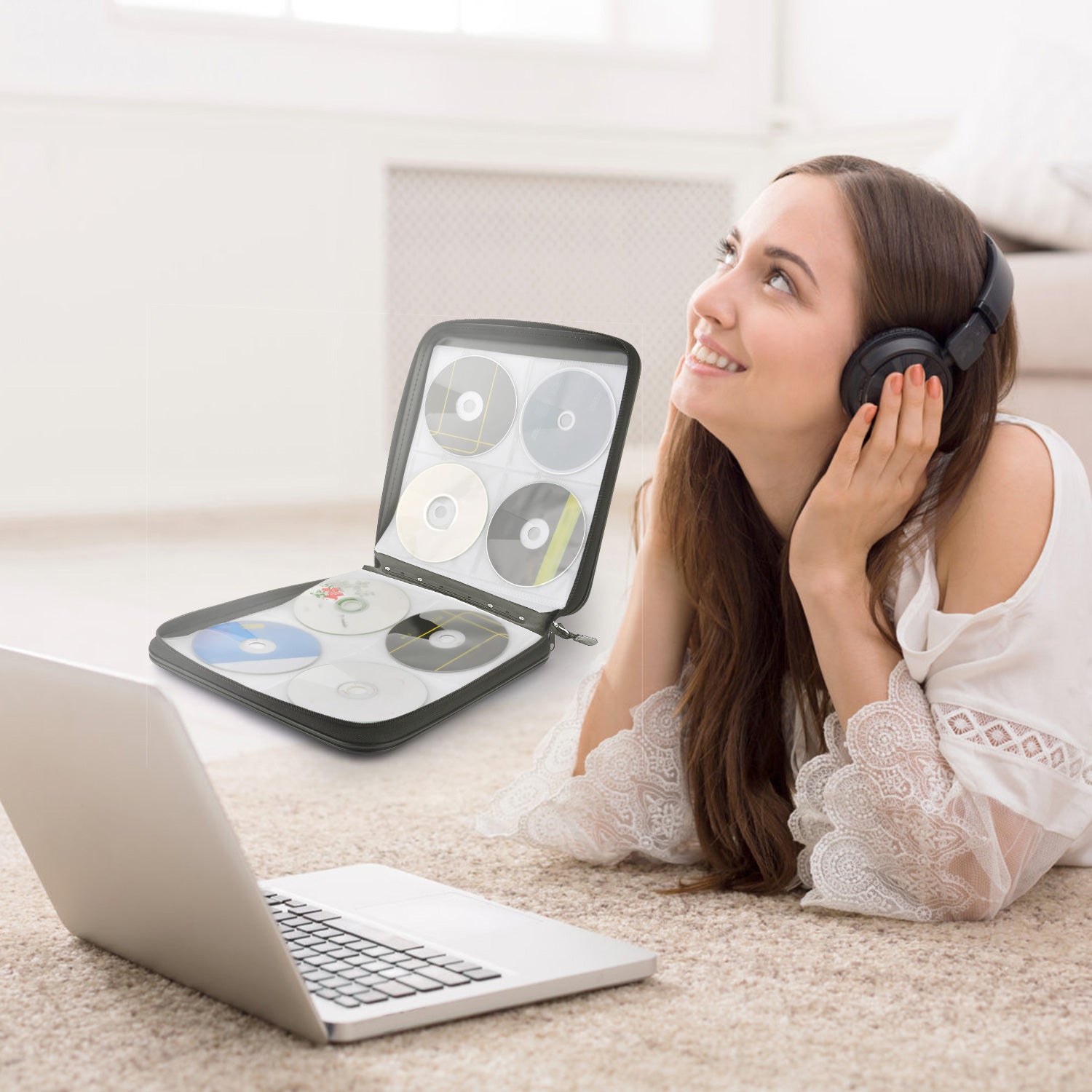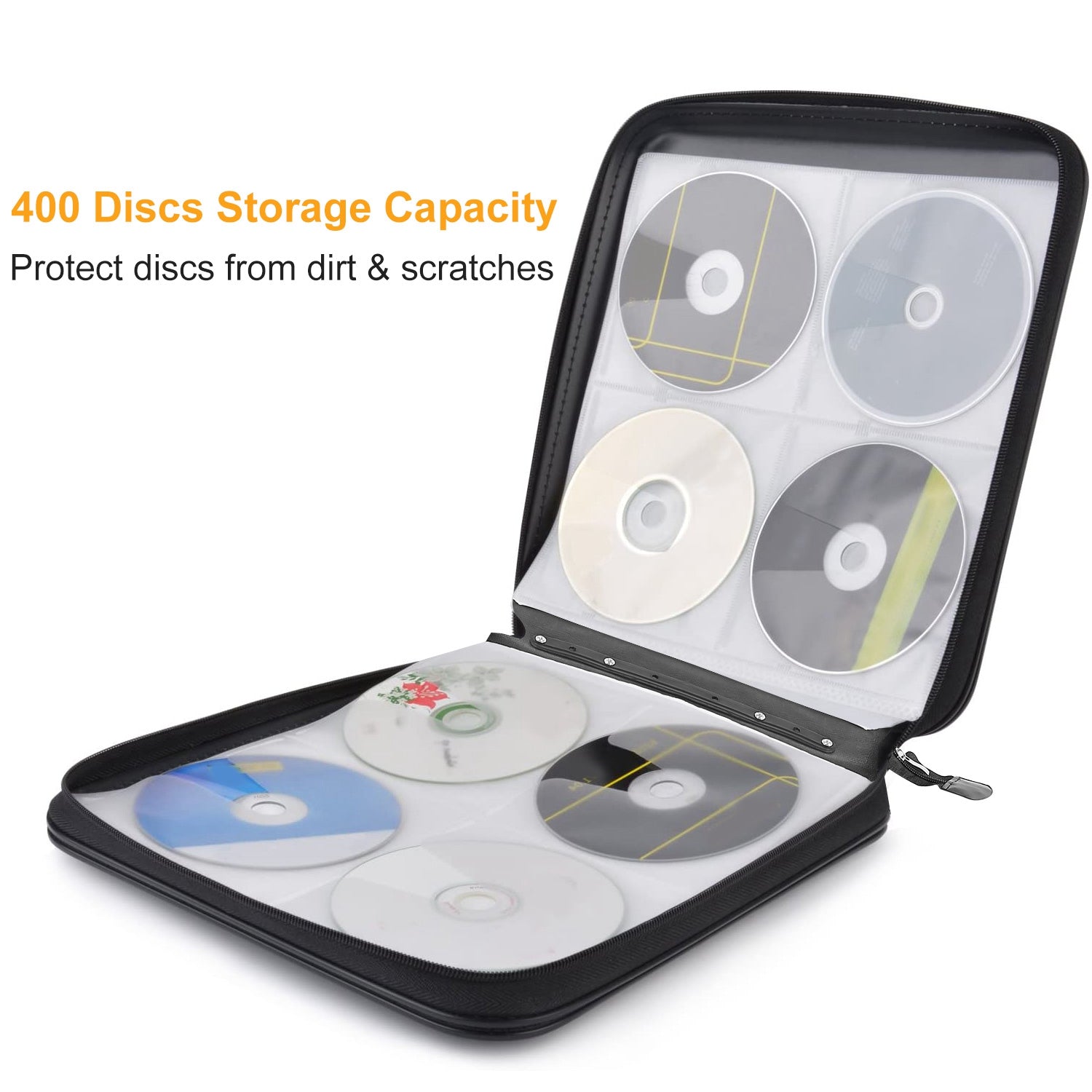 - 50 pages 400 Capacity: 8 disc per page, store up to 400 discs with transparent plastic sleeves. With this compact case, it is space-saving to store.