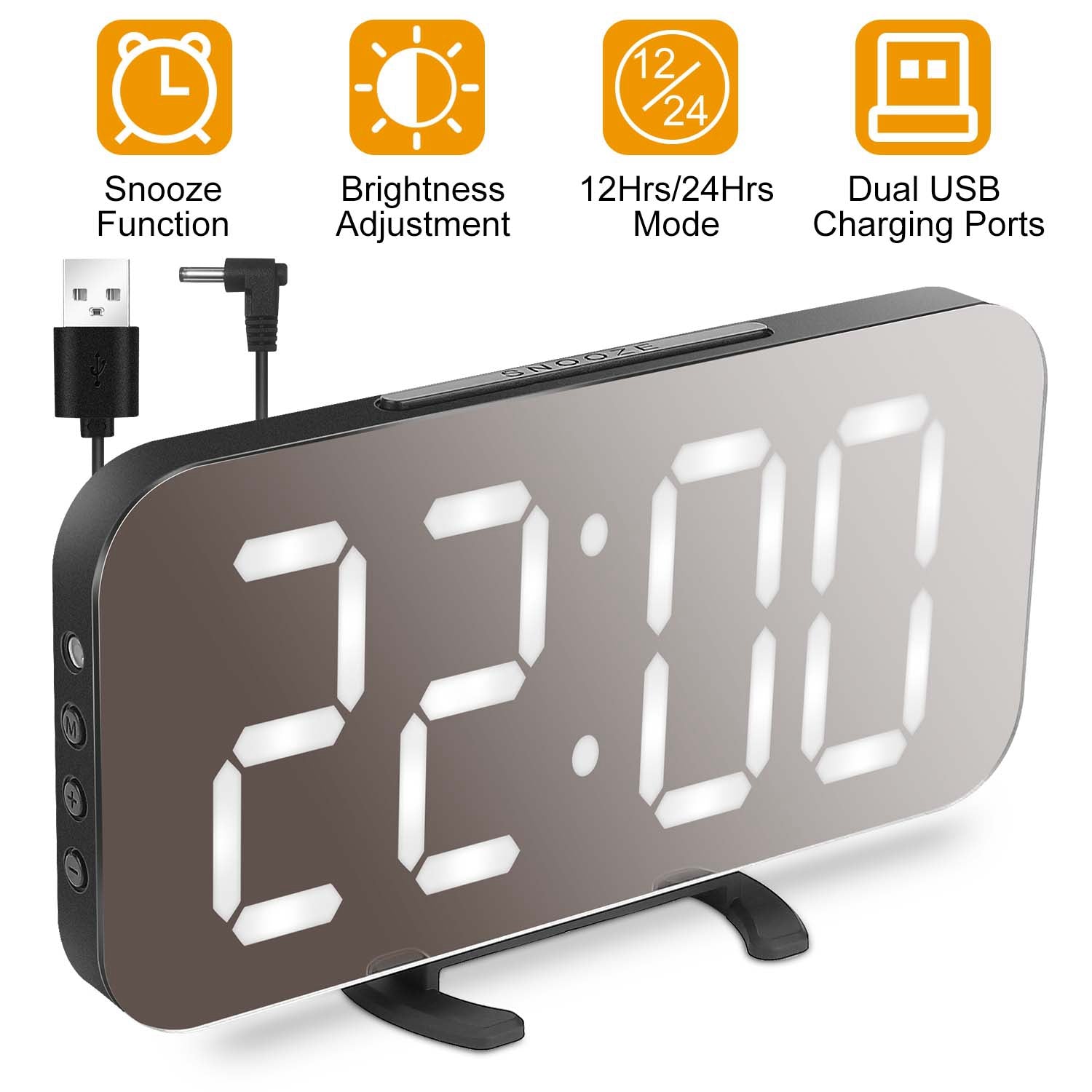 Mirror LED Alarm Clock Electronic Snooze Night Light Alarm Clock with Dimming Mode 3 Level Brightness Dual USB Ports