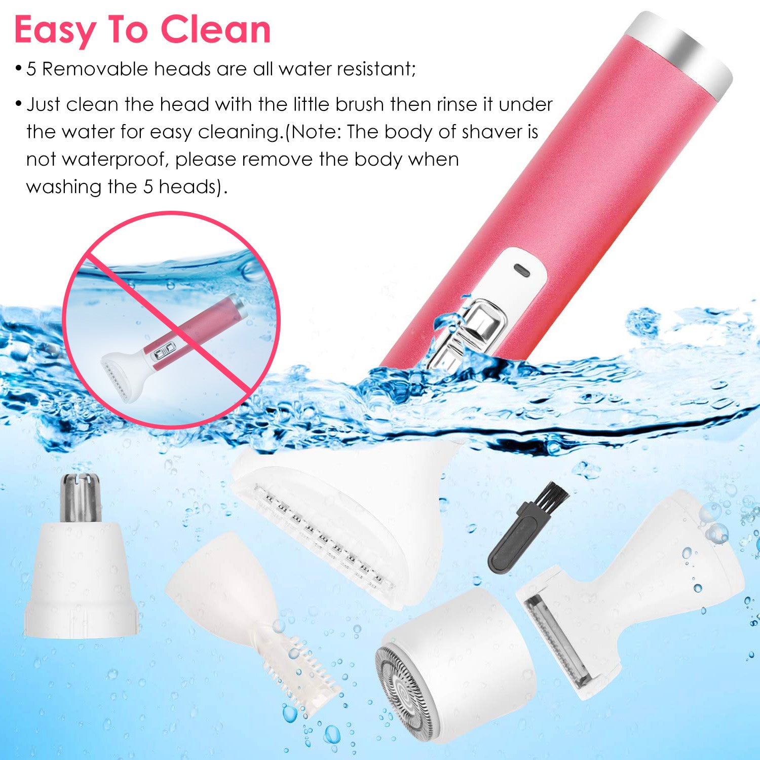 - *Easy To Clean*:5 Removable heads are all water resistant,so that you just need to clean the head with the little brush then rinse it under the water for easy cleaning.(Note:The body of shaver is not waterproof,please remove the body when washing the 5 heads).