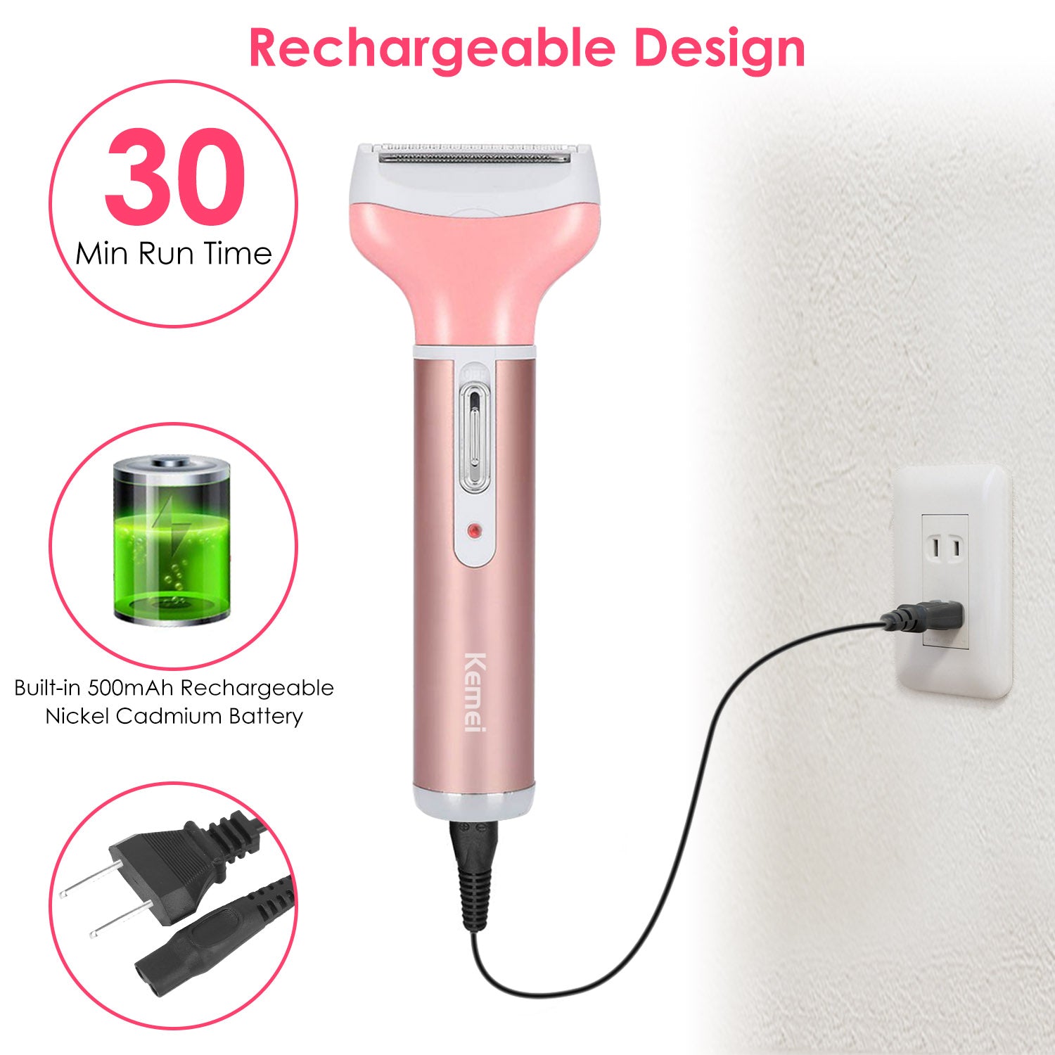 - *4 In 1 Ladies Electric Shaver*:The 4 in 1 Hair Remover includes 4 interchangeable hair removal razor heads:nose hair trimmer,eyebrow trimmer,body shaver,beard trimmer and lady shaver,which can help you to remove unwanted hair,you can use on eyebrow,face peach fuzz,cheeks,upper lips,chin,neck,bikini line,arm,leg and other body area. And the one-button design is very easy to use anytime.
