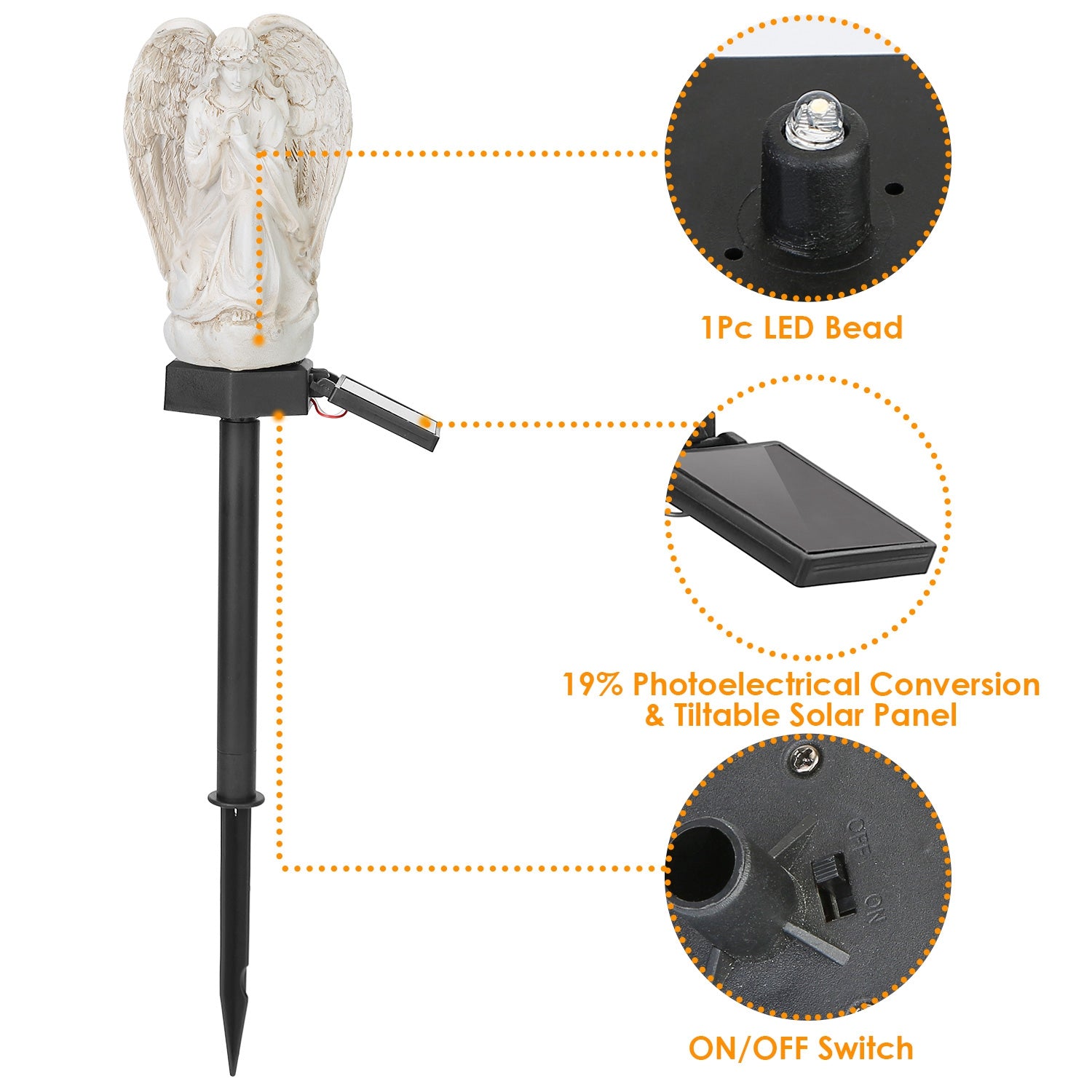 - *Unique Praying Angel Design*:The unique praying angel figure light with 1Pc warm white LED bead, adding a fairy and holy atmosphere to the garden. Made of resin and plastic, non-toxic, it is safe to your pet.