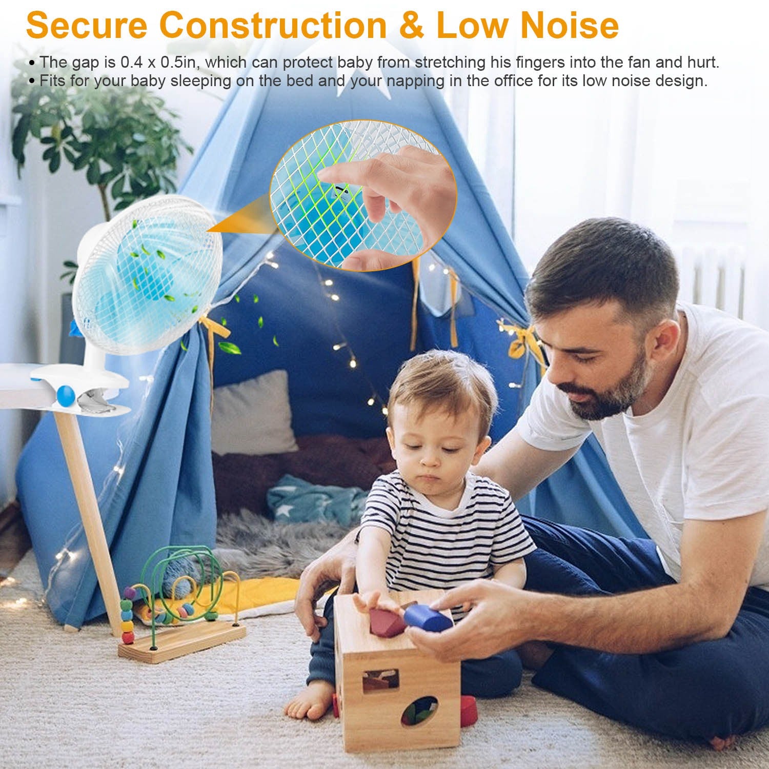 - *Secure Construction & Low Noise*:It fits for your baby sleeping on the bed for its low noise design. Besides,the gap of the fan is .4 x .5in, which can protect baby from stretching his fingers into the fan and hurt. It also fits for your napping in the office.
