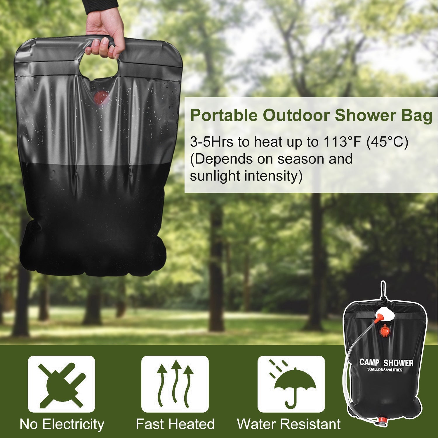 Portable Solar Heated Shower Bag Camping Shower Bath Water Bag 5 Gallons w/ On-Off Switchable Shower Head