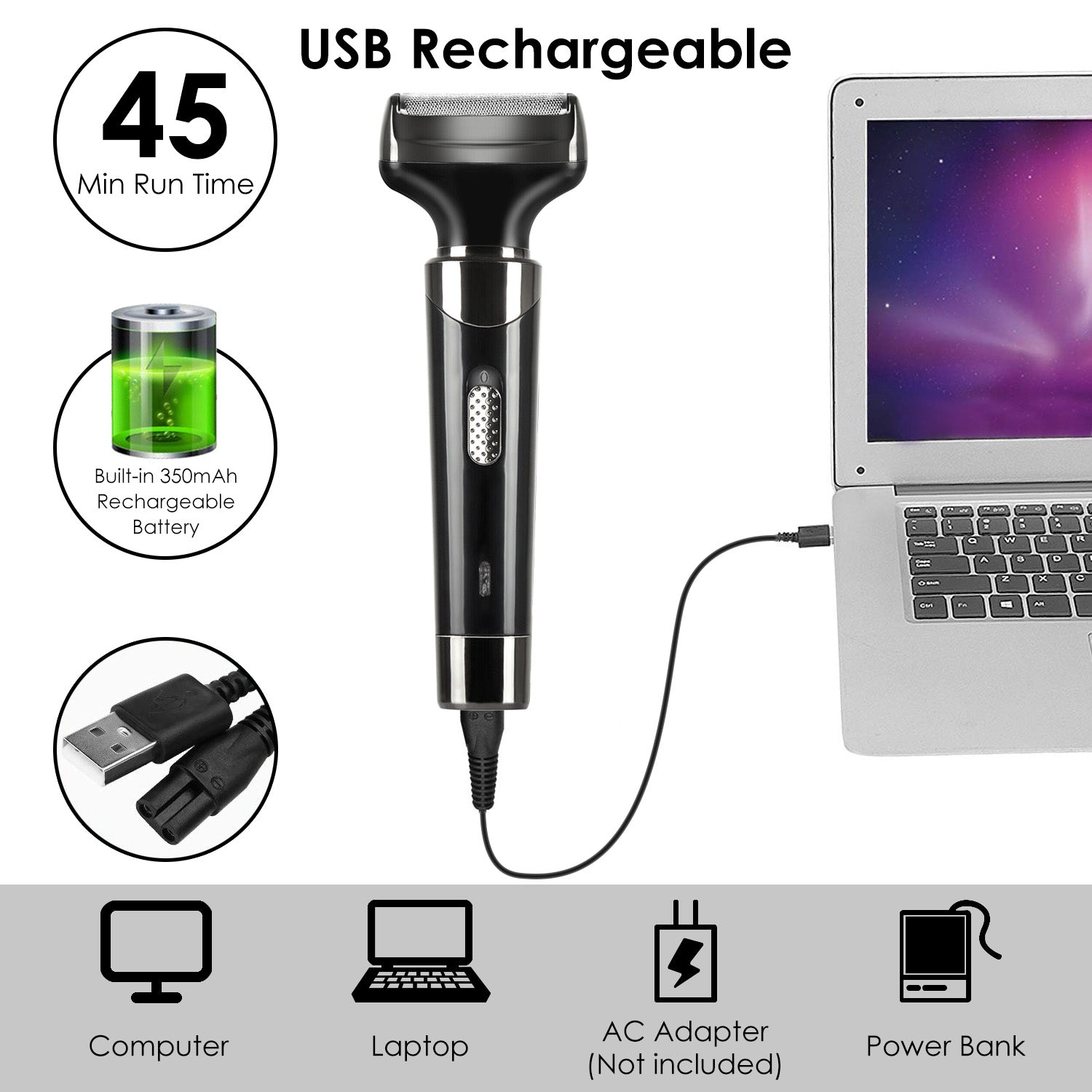 - *USB Rechargeable*:Built-in 350MA rechargeable battery,our facial shaver can run for about 45mins on a single recharge of about 8 hours, which can be charged conveniently by laptop, power bank, etc..