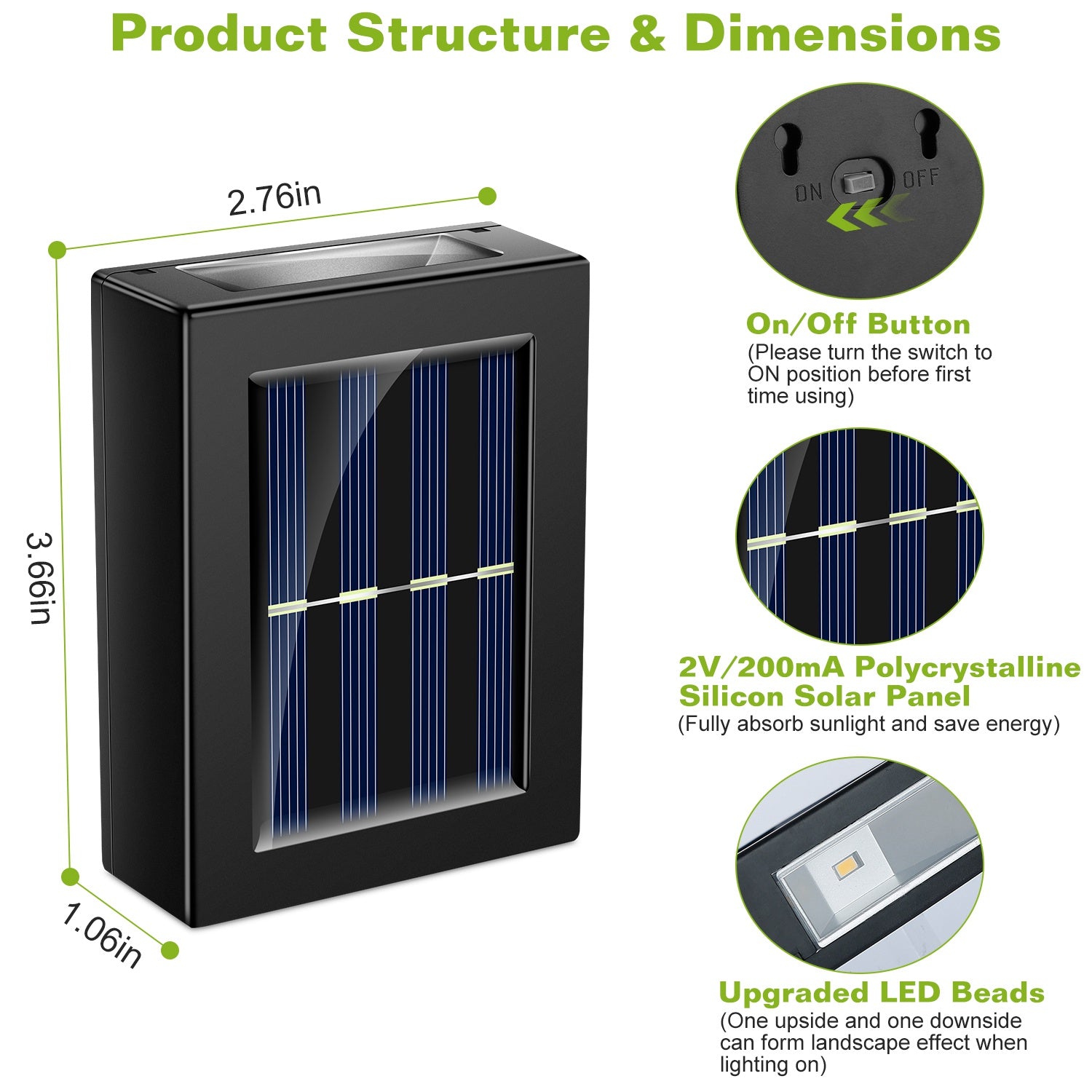 - **Upgraded Solar Deck Light*:Our solar deck wall lights adopt upgraded 2 LED beads per light(one upside and one downside)and is powered by solar,no electricity and energy saving,forms a landscape lighting effect when installing our deck lights in a row.
