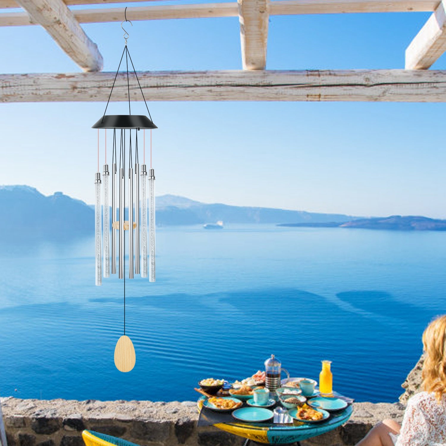 - *Crisp & Pleasure Wind Chime Sound*:Our Solar Wind Chimes consist of 8 high-quality tubes(4 Aluminum Tubes & 4 Acrylic Tubes) and pine pendants. It will emit crisp and pleasure sounds when the breeze blows. It can help us relieve stress, relax us and reconnect us with nature.