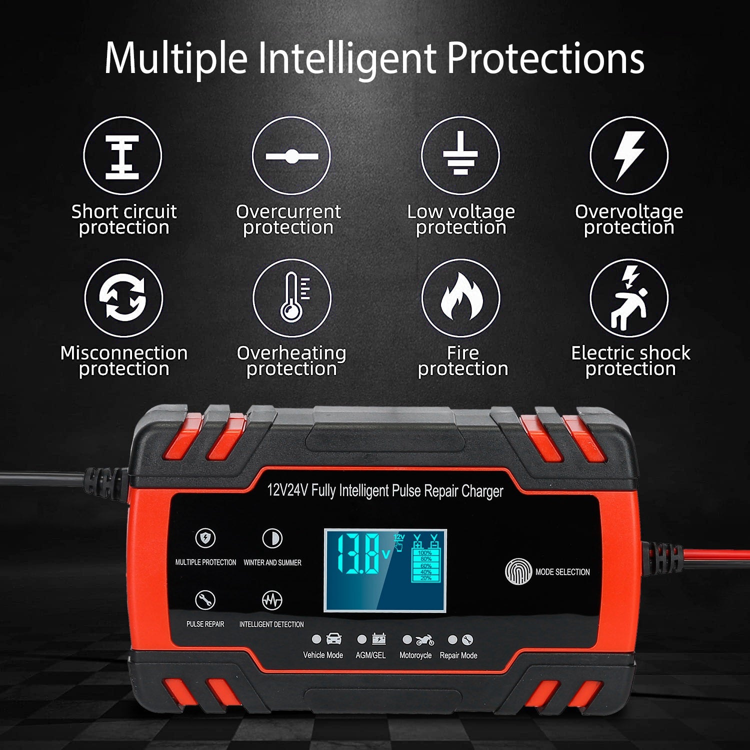 *Multiple Safety Protection*:Built-in circuit protection,our automatic smart battery charger guards against short circuit, overcurrent,overheat, fire, low voltage, over voltage, reverse connection and electric shock.