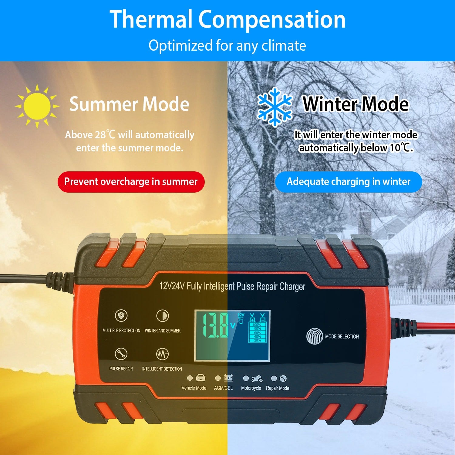 *Latest Intelligent Chip Control*:Portable battery charger automatically adjusts the charge current and maintainability according to the temperature. Automatic detection of ambient temperature, so that winter can be full speed,summer is not overload.