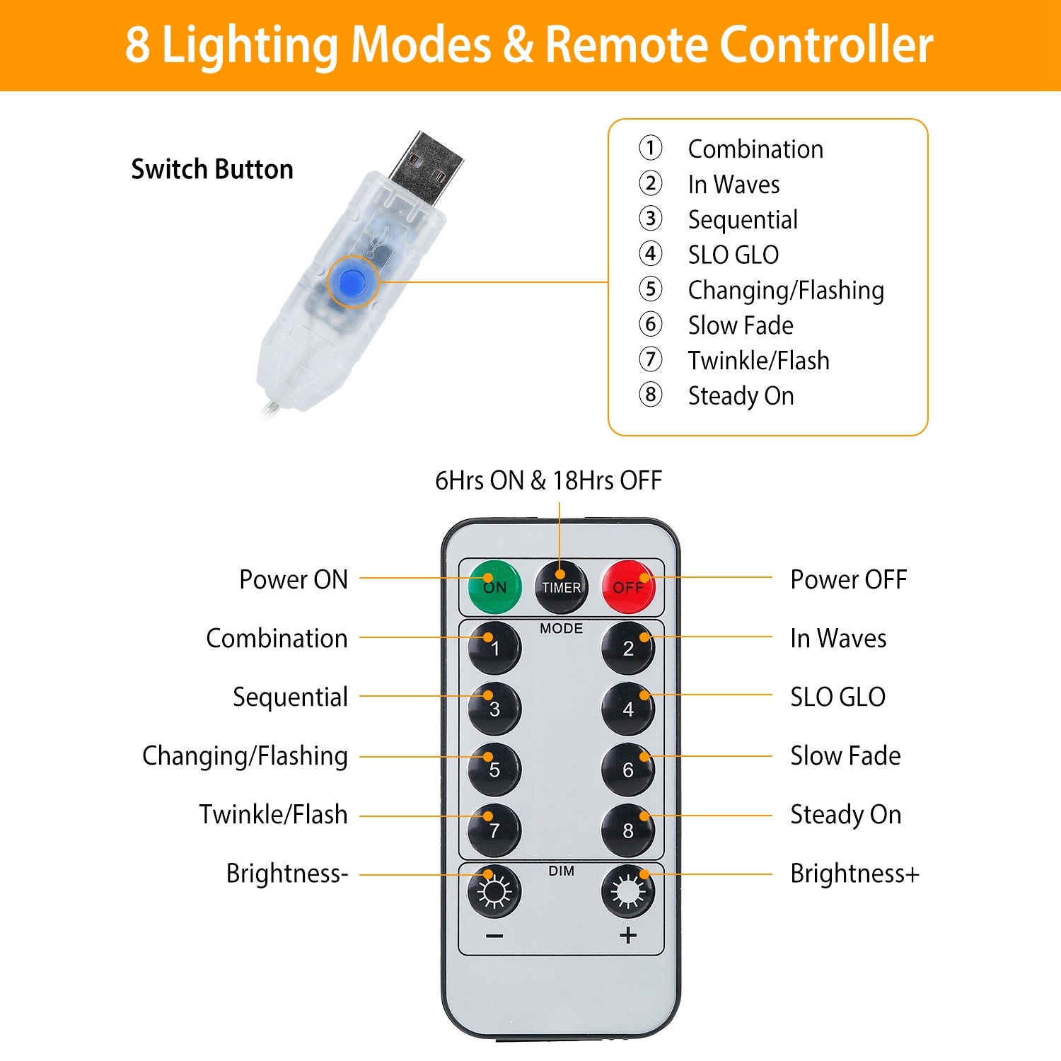 - *Convenient Timer Setting & Remote Controller*:You can set the timer to auto turn on for 6 hours and turn off for 18 hours, energy-saving and eco-friendly and it won't heat after a long time use, safe for your decoration! With a remote controller, it's easy to turn ON/OFF,adjust different modes,timer setting and light brightness according to your needs.