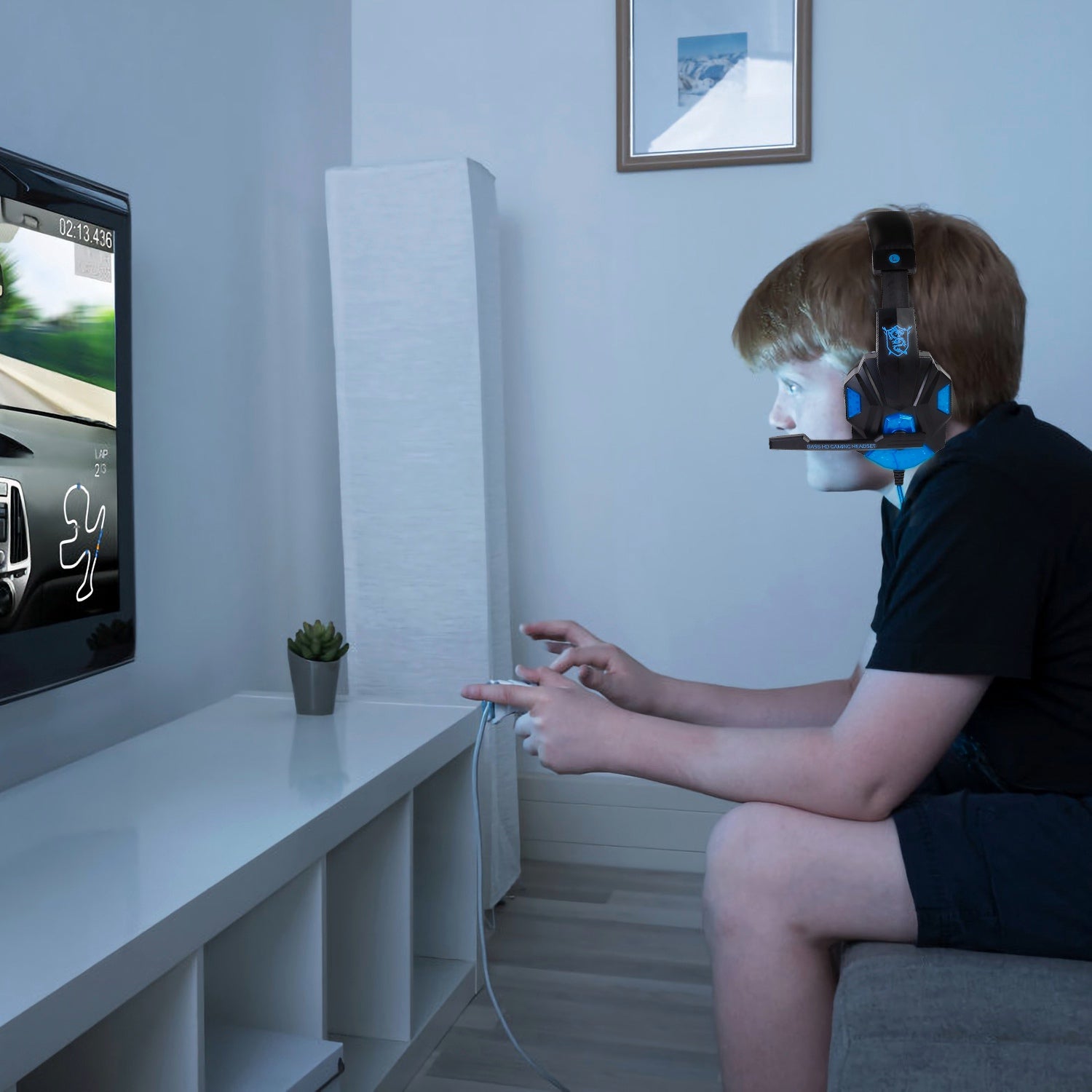 - **COMFORTABLE WEARING*:Superior comfortable and good air permeability PU leather over-ear and over-head pads can reduce heat sweat and provide you immersive music experience. Skin-friendly PU leather suits for a longer period of wearing. 11.81in-14.17in Adjustable headbands suit your needs. Glaring LED lights(USB plug must be plugged in) designed on the ear cups to highlight game atmosphere.