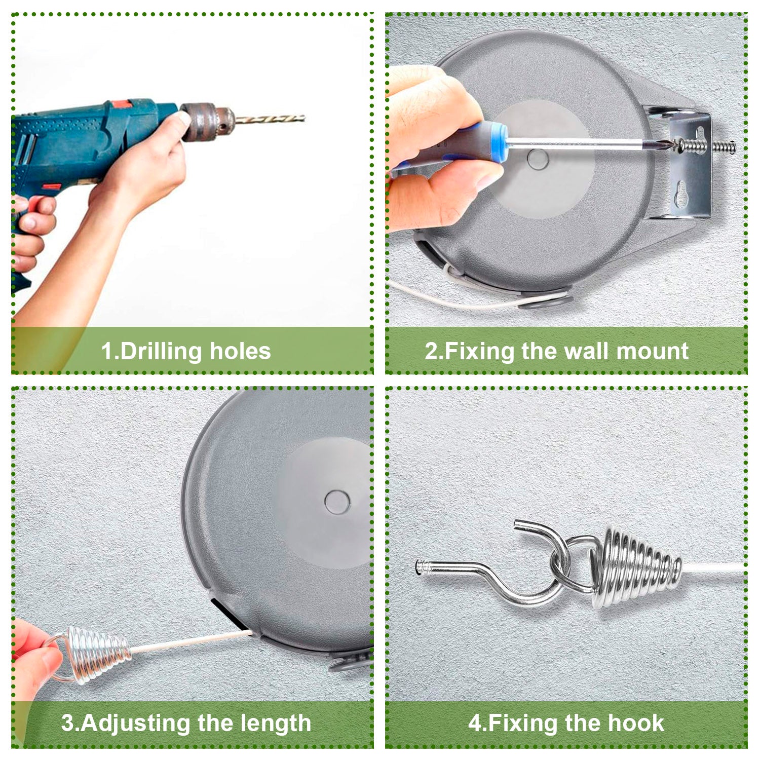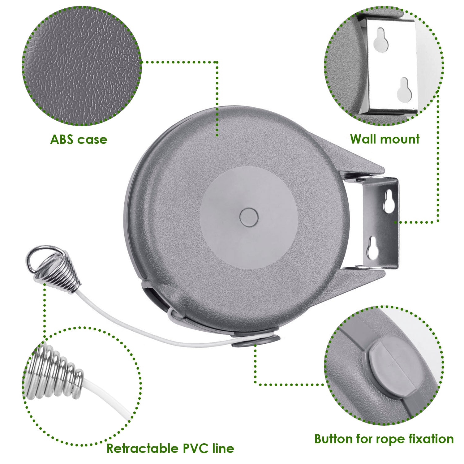 - *49FT Long & Easy Installation*:49 Feet long clothes line enables you to hang clothes of all your family members. Just wall mount the line in minutes and use the lock button to fix the rope any length you want. Premium ABS Material:The case is made of ABS material, crashworthy and durable. The iron wall mount and PVC line can bear up to 44lbs.