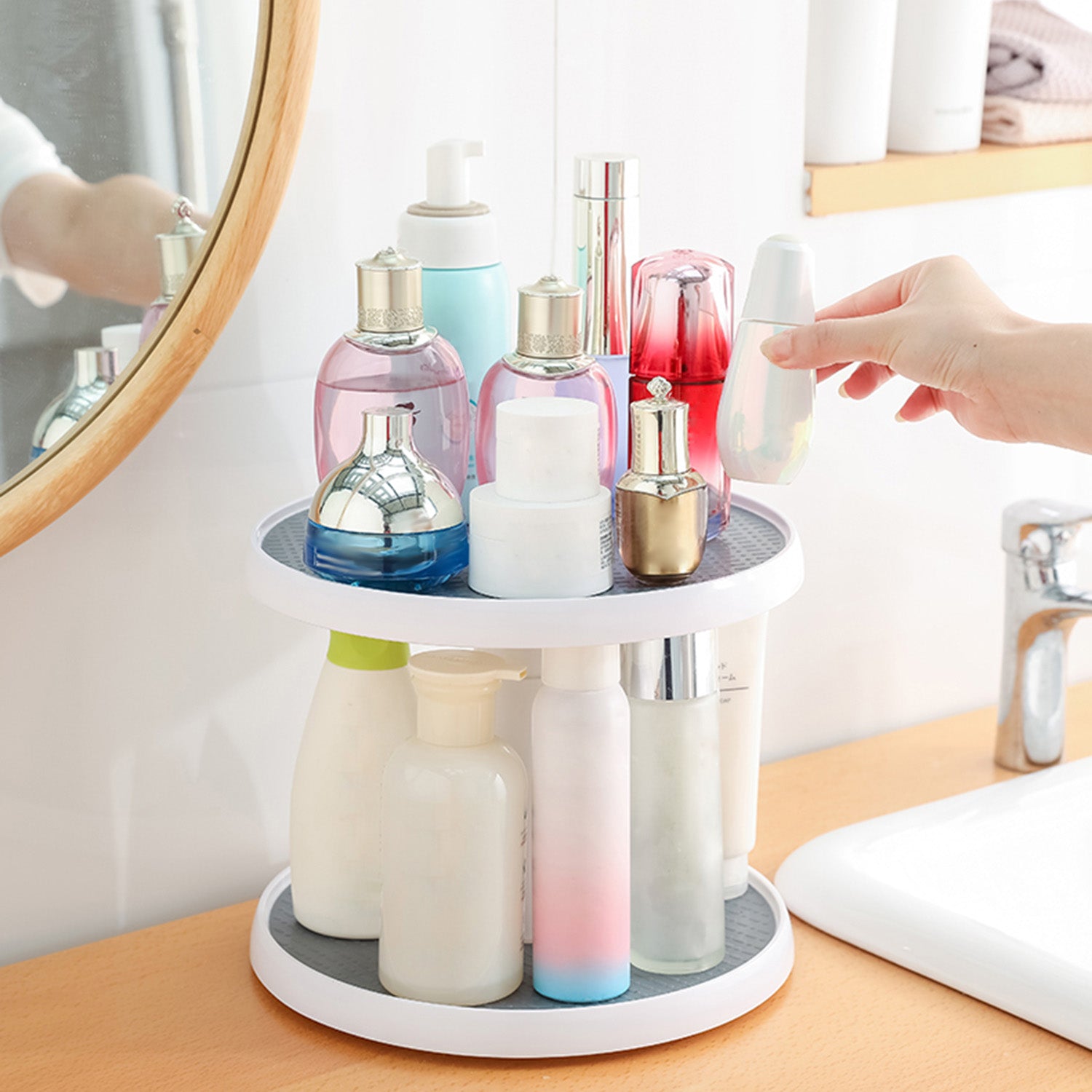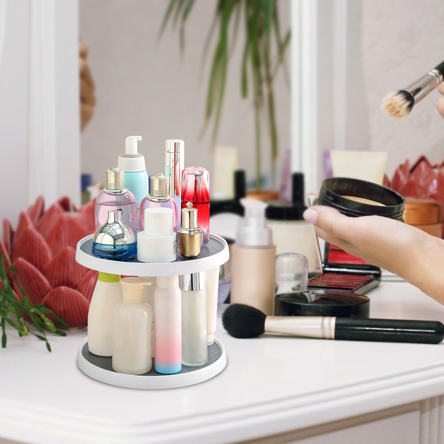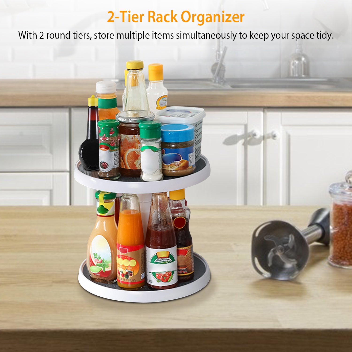 - *2-Tier Rack Organizer*:Made of HIPS and PP plastic, BPA free, durable and shatter-resistant, it's powerful and durable enough for a capacity up to 22lbs. With 2 round tiers, you can store multiple items at the same time to keep your space tidy. The layer is detachable, easy for cleaning with soap water.