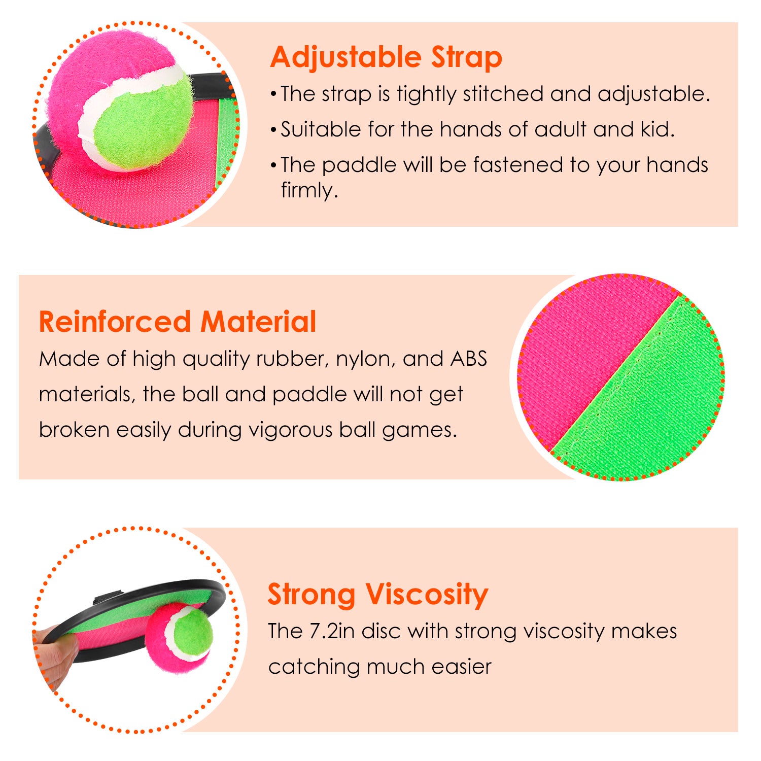 - *Hand And Eye Coordination Training*:When the ball is tossed, kids have to catch the path of ball with their eyes and stretch out the paddle quickly and precisely. The 7in sticky disc makes catching much easier. Once touching the disc, the ball will be stuck firmly. Children can enjoy the sense of achievement and be more confident.
