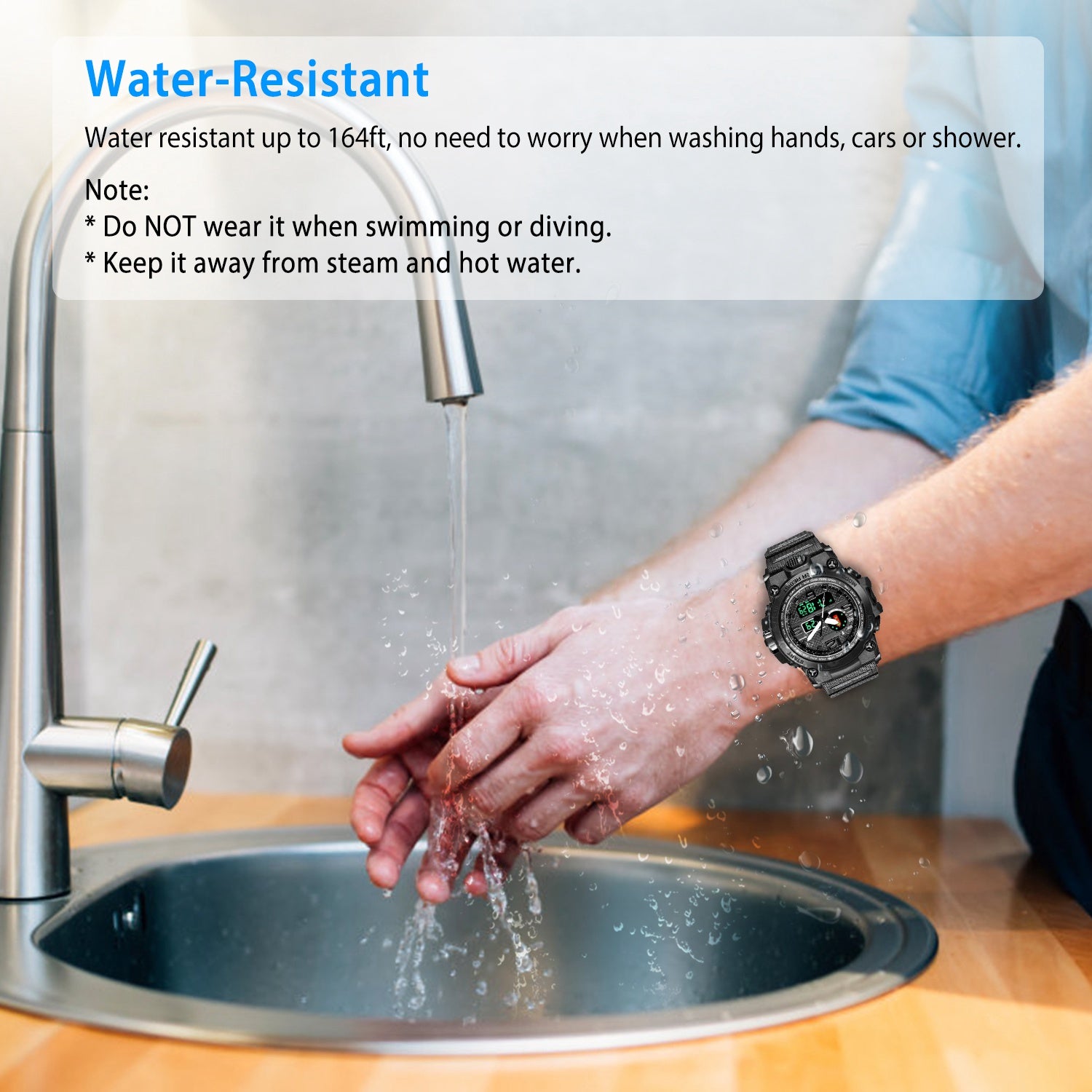 - *Water-Resistant Watch*:With water resistance up to 164ft, meet your daily waterproof need,no need to worry when washing hands, washing cars or shower. Covered with 304 stainless steel bottom to improve the waterproof performance. Note: Do NOT wear it when swimming or diving. And keep it away from steam and hot water.
