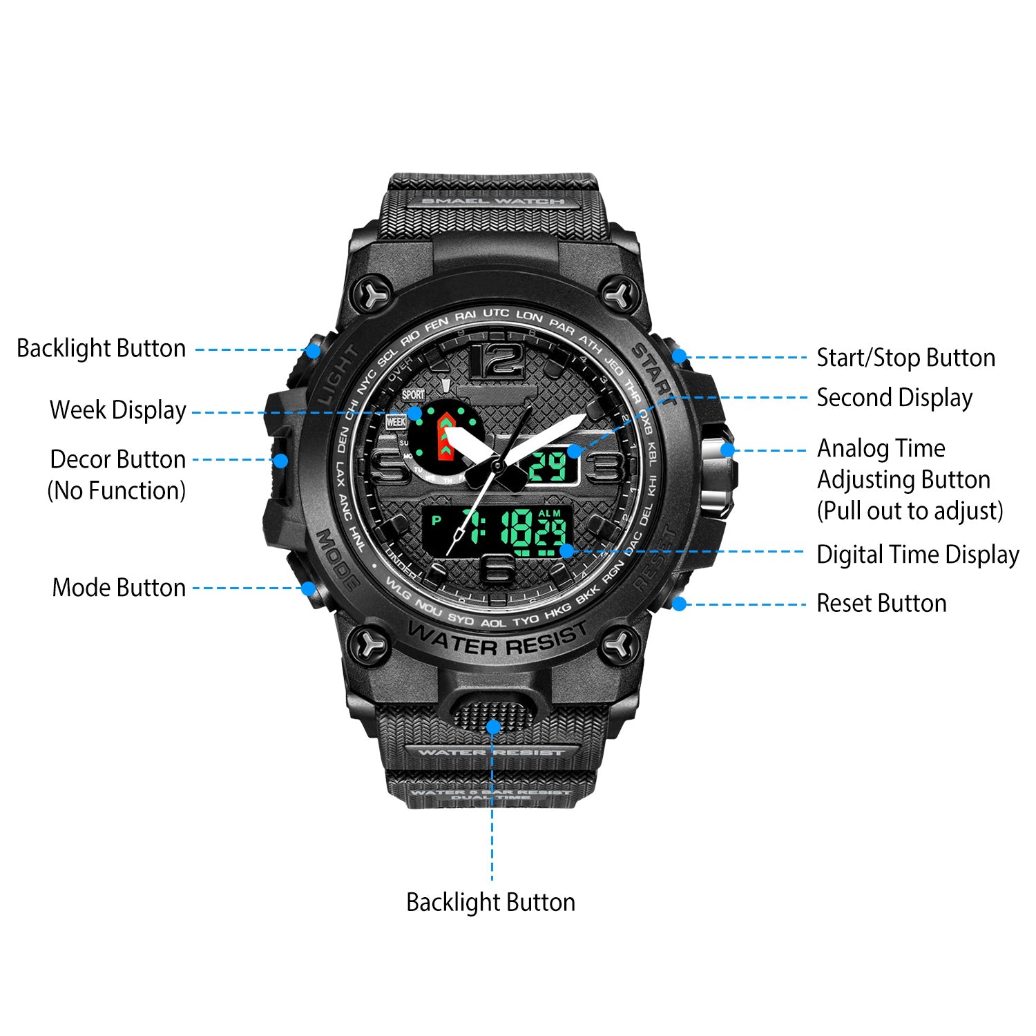 - *Dual Time Zones*:Analog and digital dual dial support two independent time zone. Simply press MODE button to adjust digital time display and pull out the right button to adjust analog time display.